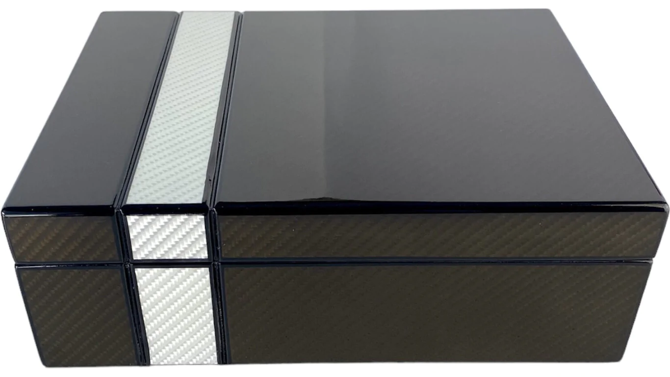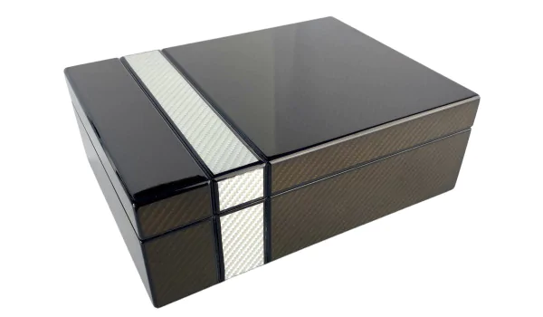 El juego comienza con un humidor de sobremesa perfectamente adecuado para proporcionar espacio para hasta 25 puros de tamaño Corona. El acabado láser en dos tonos presenta patrones de fibra de carbono oscuros y claros en contraste. Un higrómetro negro y plateado y un humidificador redondo le permiten mantener mejor sus puros. Las bisagras cromadas, el interior de cedro español y el separador, ponen el toque final al sofisticado diseño del humidor.
