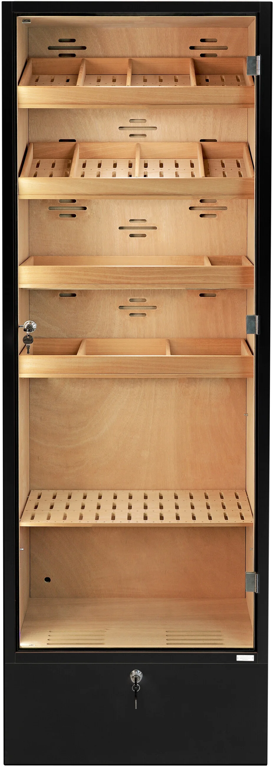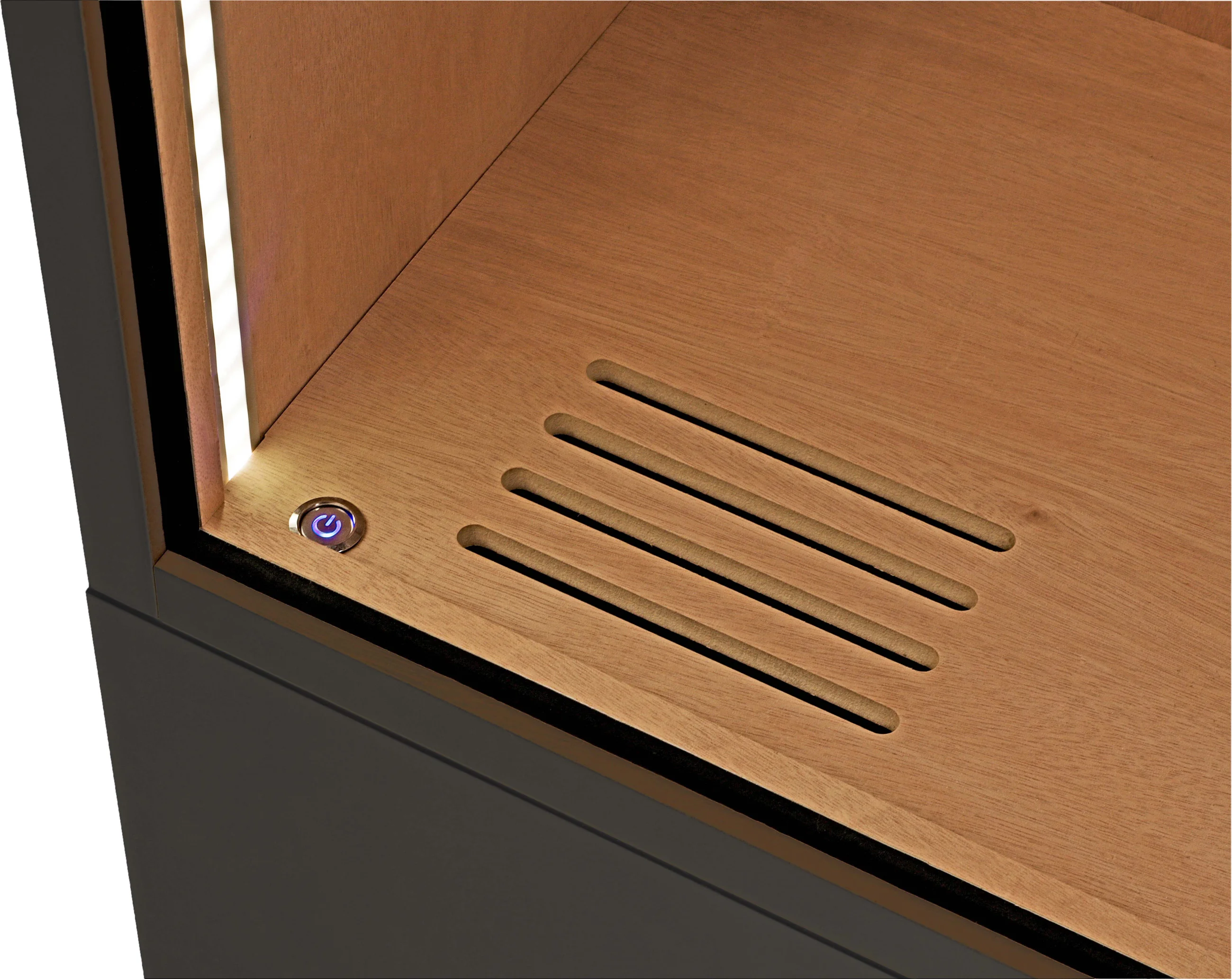 - El interior del armario humidor es de chapa de cedro y tiene un segundo panel trasero con circulación de aire.