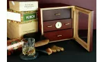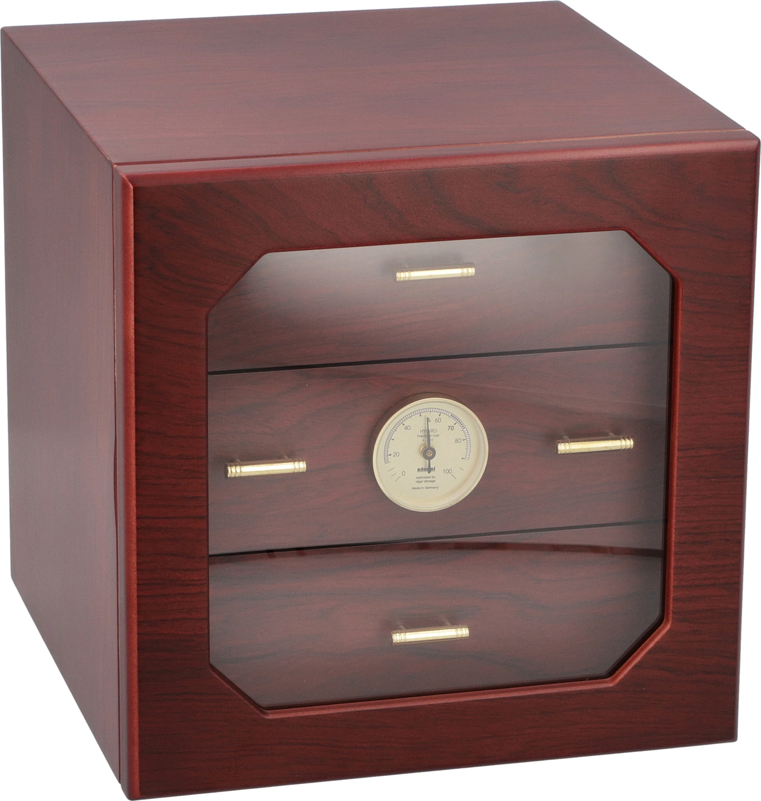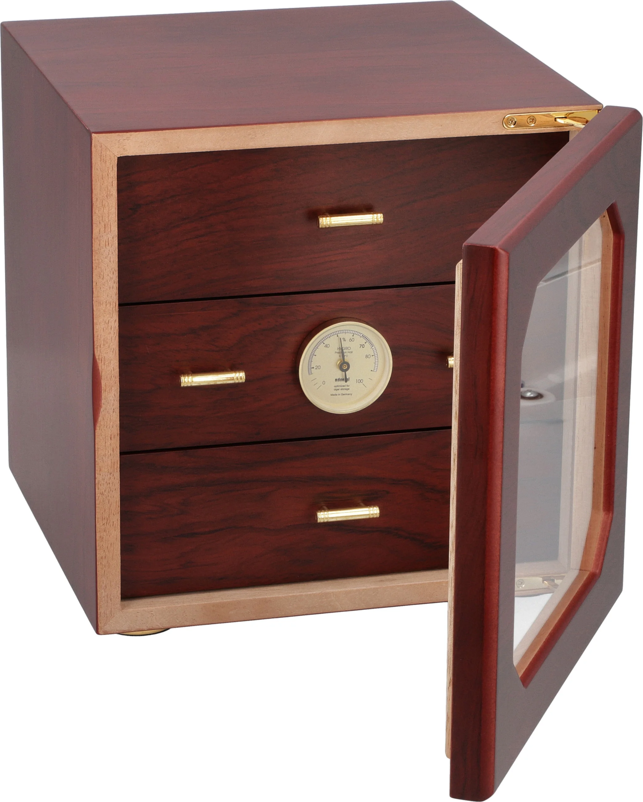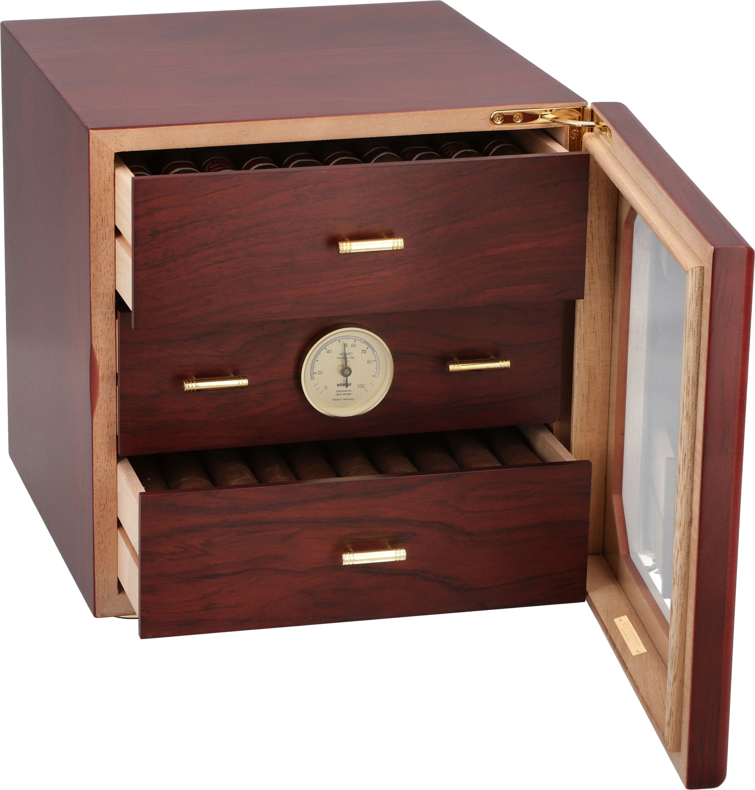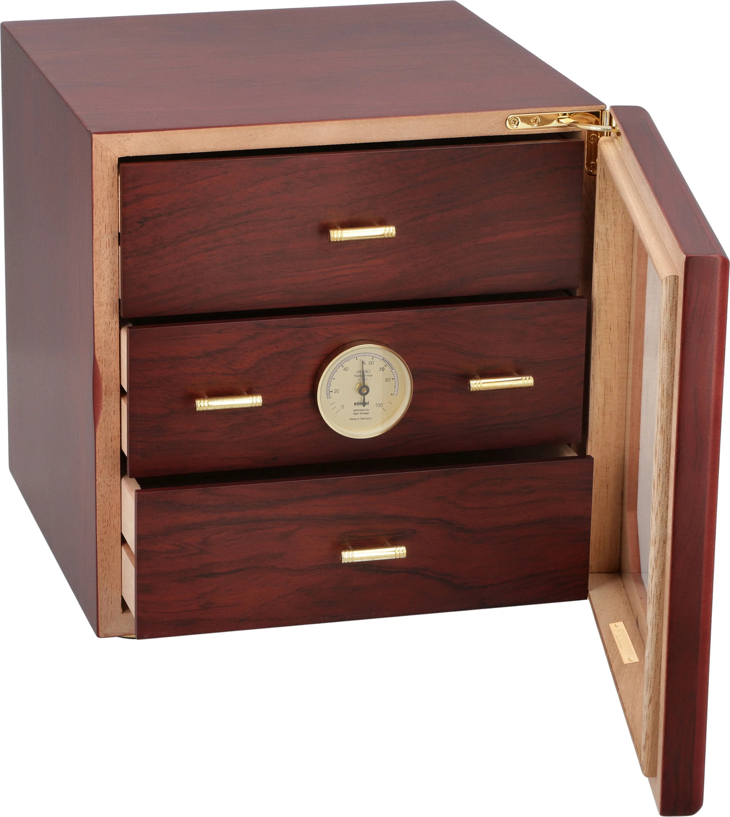 El humidor puede acomodar más de 125 puros estándar de tamaño Corona, que se mantendrán en óptimas condiciones gracias al humidificador deluxe dorado con base de polímeros acrílicos. Las aberturas de ventilación ajustables le permiten refinar el nivel de humedad para cumplir con las especificaciones deseadas. Hay un higrómetro de pelo de precisión precalibrado en la parte frontal del cajón central que requiere solo de un vistazo rápido para verificar los niveles de humedad, tanto si el humidor está abierto o cerrado.