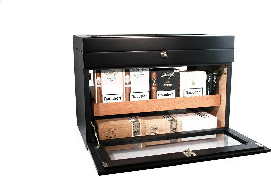 - Optional trays for individual cigars and boxes can be inserted and optionally angled for optimal presentation.