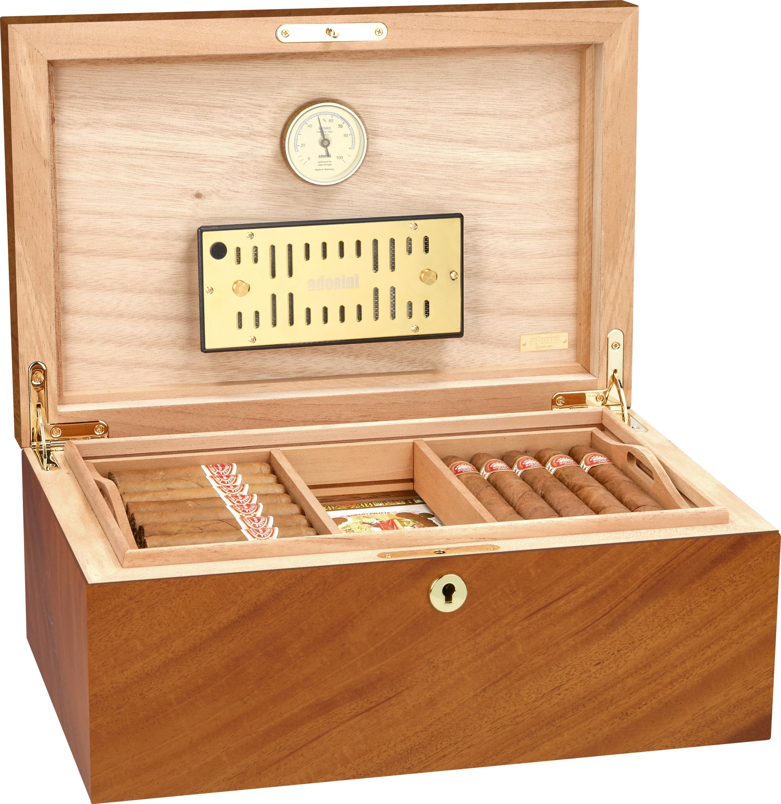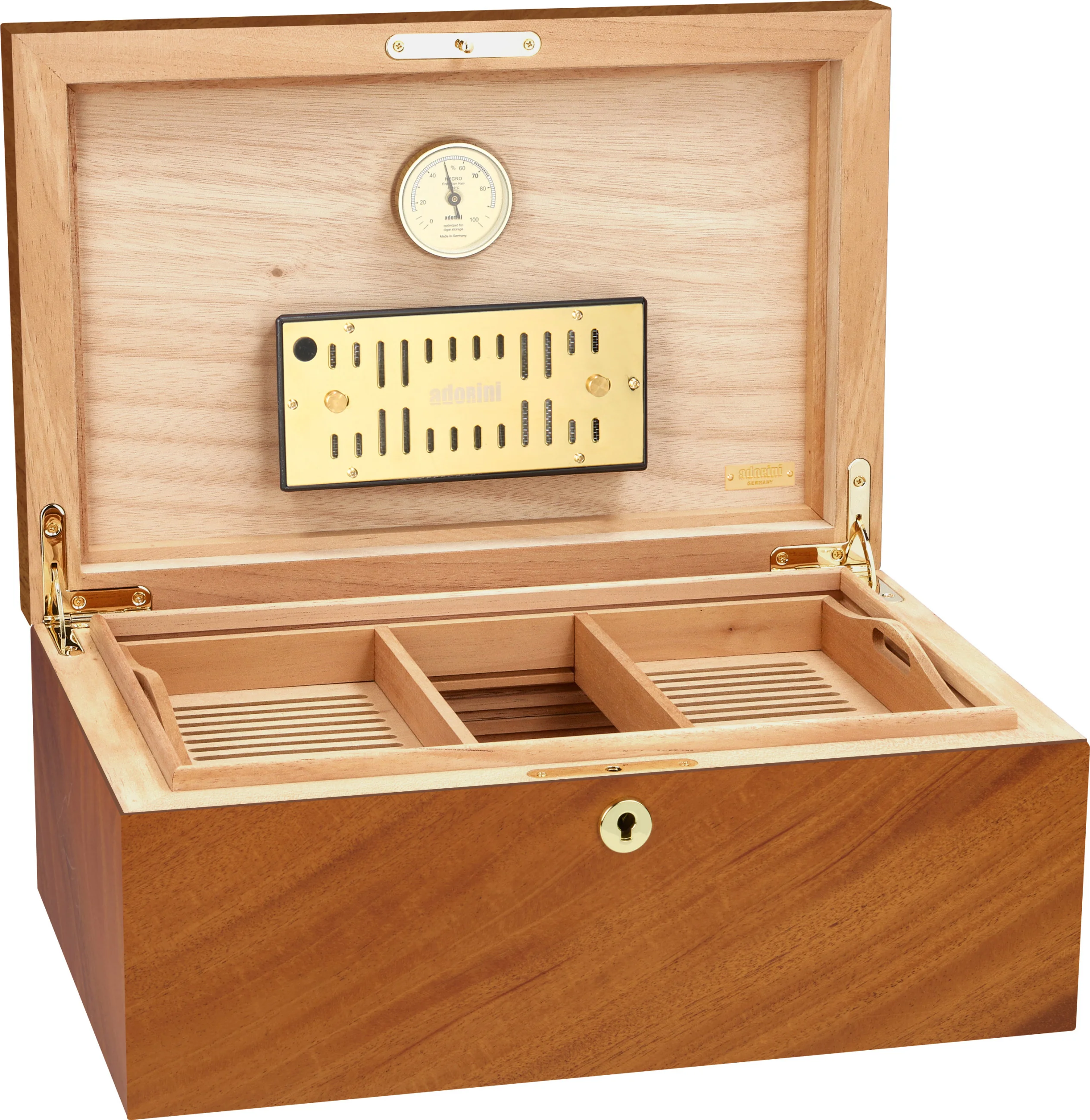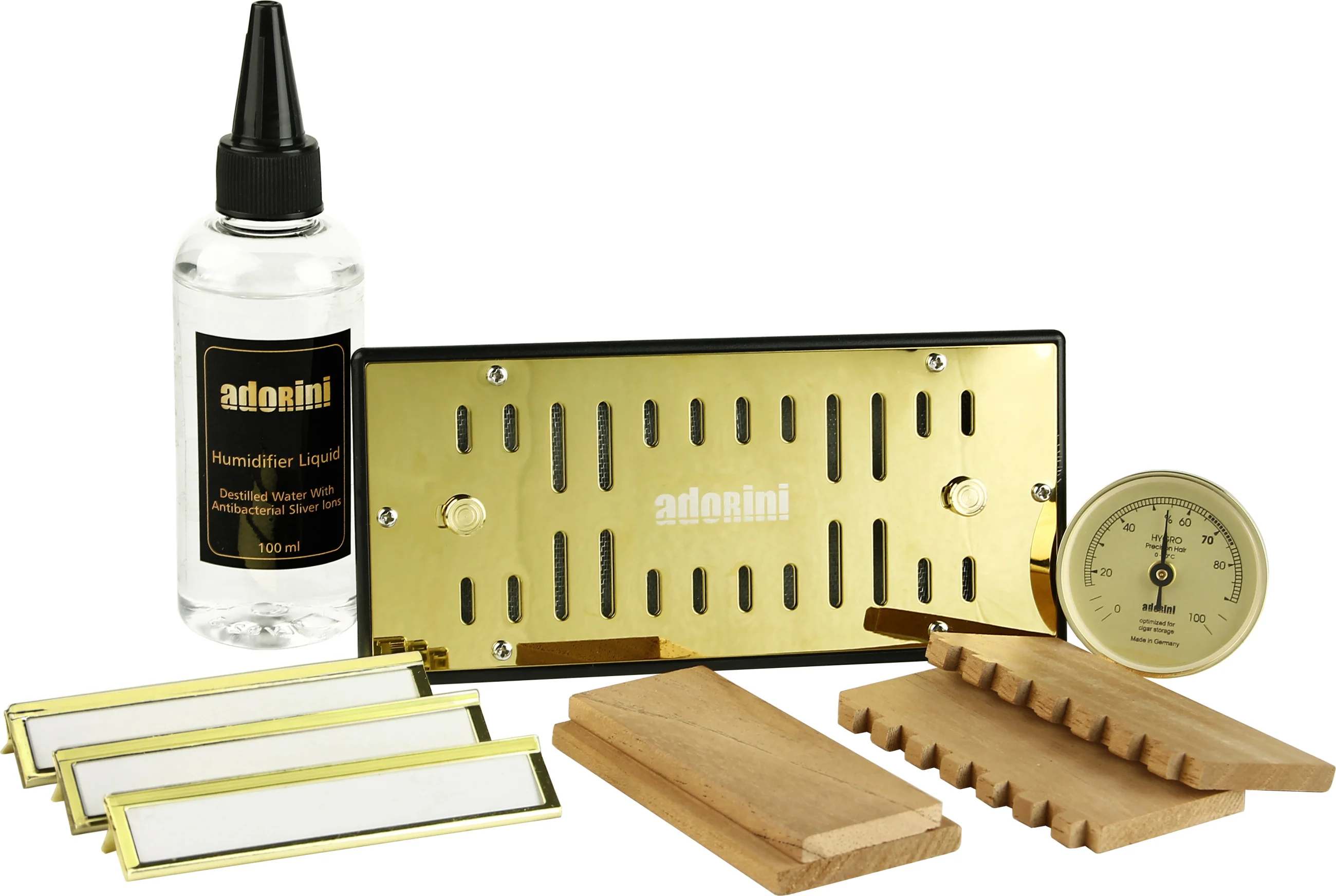 - Humidificador Adorini DeLuxe bañado en oro con humidificación por fibras acrílicas y aberturas de ventilación con tamaño ajustable para una regulación óptima del nivel de humedad