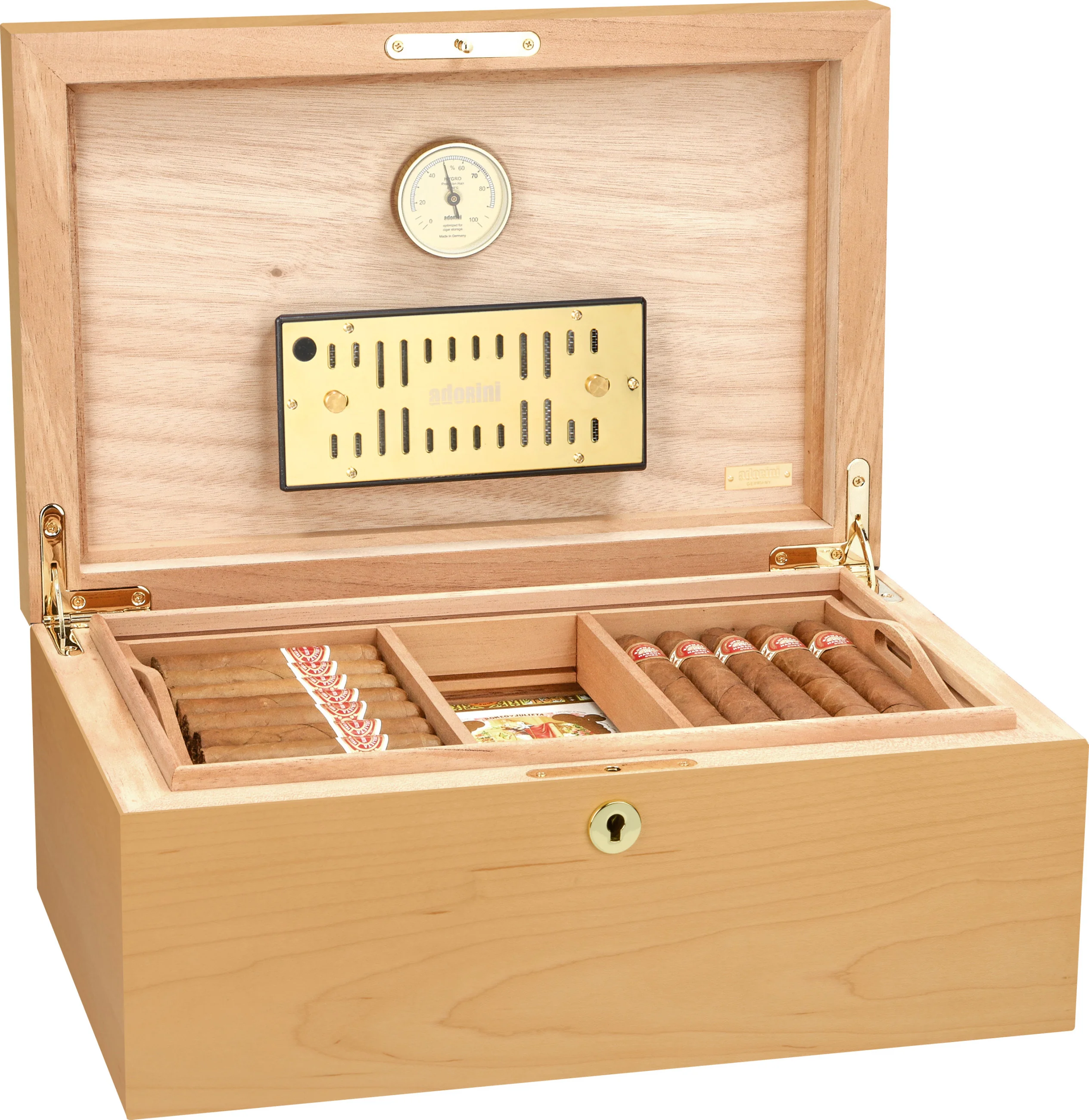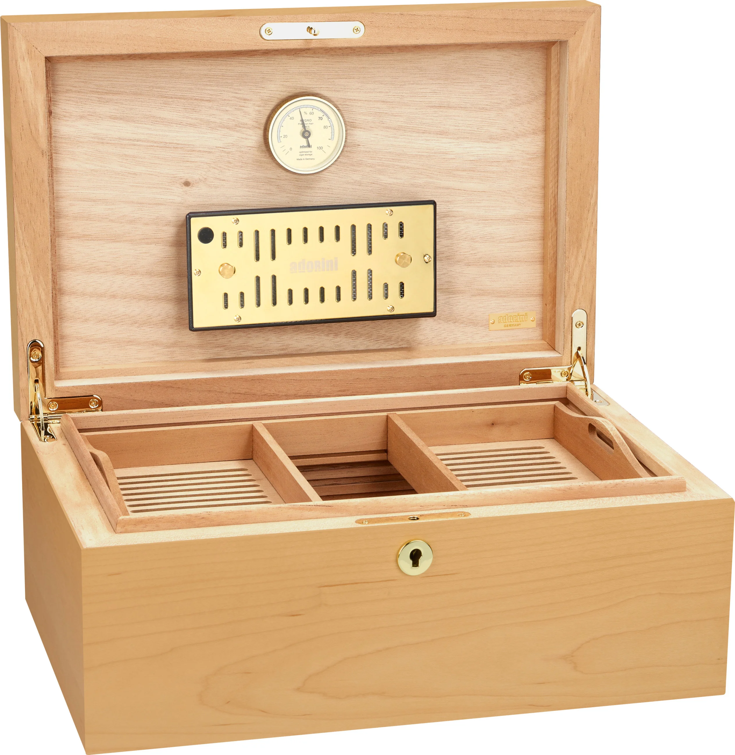 - Humidificador Adorini DeLuxe bañado en oro con humidificación por fibras acrílicas y aberturas de ventilación con tamaño ajustable para una regulación óptima del nivel de humedad