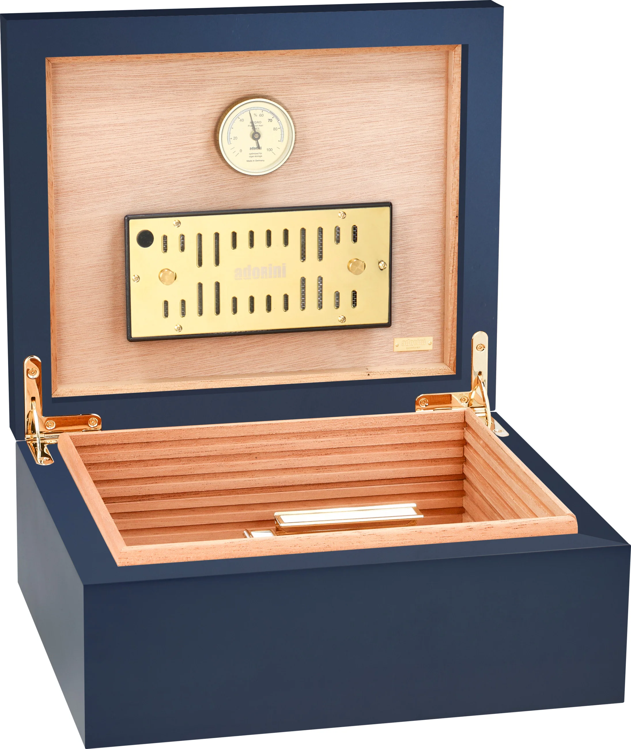 - Humidificador Adorini DeLuxe bañado en oro con humidificación por fibras acrílicas y aberturas de ventilación con tamaño ajustable para una regulación óptima del nivel de humedad