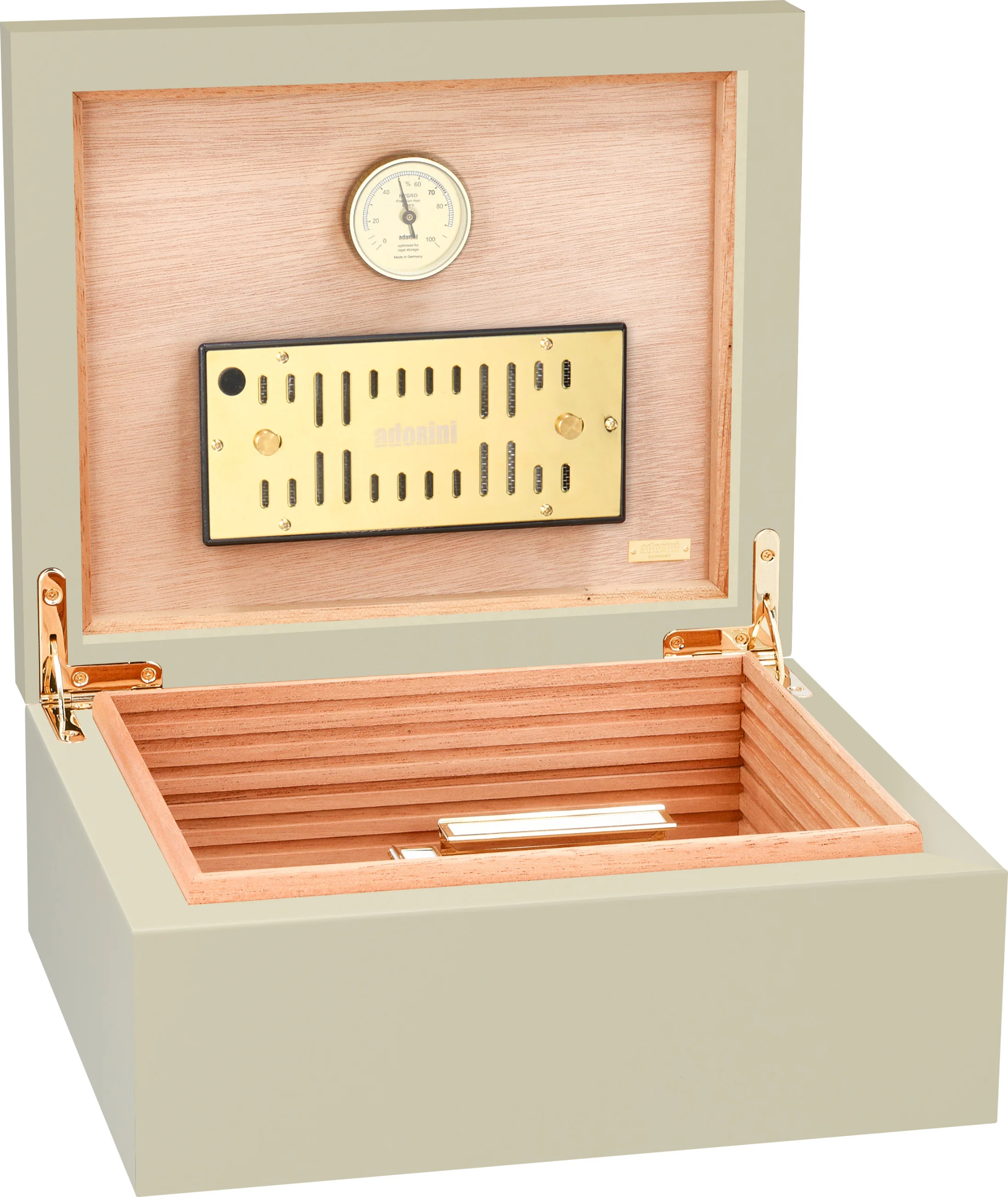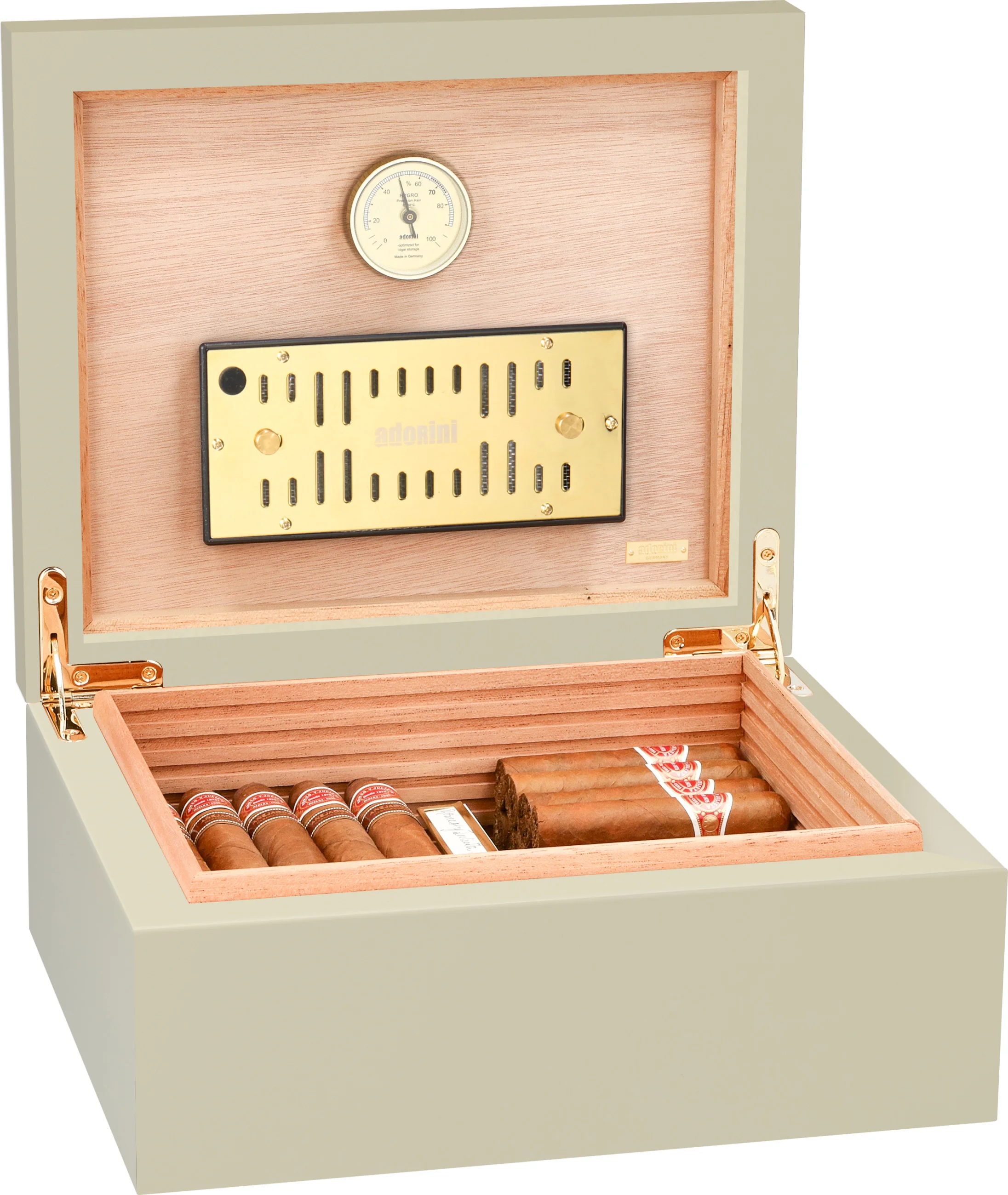 - Humidificador Adorini DeLuxe bañado en oro con humidificación por fibras acrílicas y aberturas de ventilación con tamaño ajustable para una regulación óptima del nivel de humedad