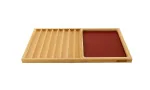 La Bandeja de Servicio para Puros adorini con Incrustación Roja es una forma elegante y práctica de presentar sus puros con estilo. Esta bandeja de alta calidad, hecha de madera de cedro, es perfecta para su uso en hoteles, bares, salones de puros o en hogares privados. La incrustación roja de cuero italiano liso protege sus accesorios para puros de arañazos y asegura un agarre firme. La bandeja cuenta con ocho ranuras que proporcionan espacio para los puros, los cuales también se pueden apilar. Acomoda todos los formatos de puros hasta una longitud de 18.5 cm y mide 34 x 19.5 x 1.3 cm. La bandeja de servicio adorini también está disponible sin la incrustación de cuero rojo en nuestra tienda.