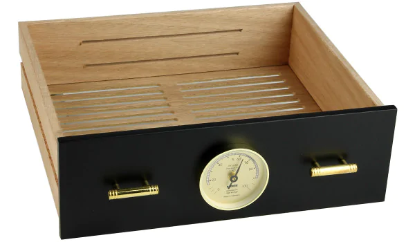 - Diseño elegante: Dotado de tiradores dorados y un frontal en negro mate, este cajón aporta un toque de sofisticación a cualquier humidor.