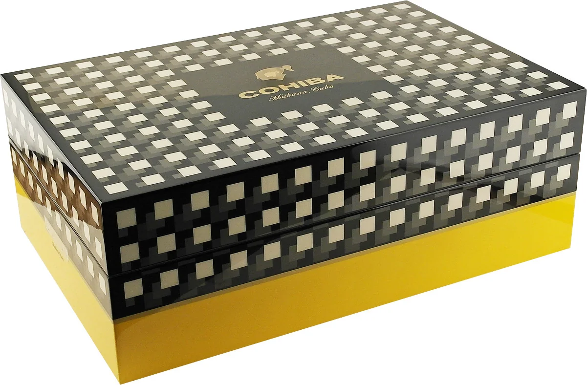El humidor se presenta en los inconfundibles colores de Cohiba, negro, amarillo y blanco, que los aficionados de todo el mundo asocian inmediatamente con la marca. El logotipo de la marca Cohiba aparece en un lugar destacado de la tapa. Al abrirla, se descubren unas bisagras doradas de gran calidad, que también llevan grabado el nombre Cohiba. En el interior, hay una placa que indica el número individual de edición limitada.