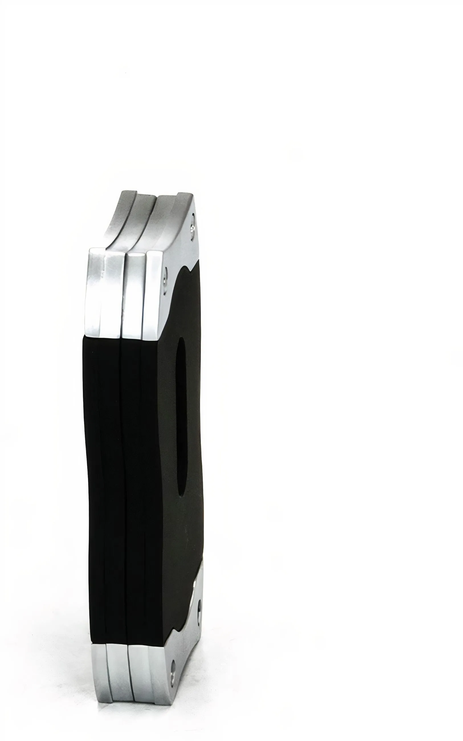 La cuchilla accionada por resorte se libera de su posición bloqueada con solo presionar un botón. La hoja de acero inoxidable afilada como una navaja cortará un puro con precisión para formar una cuña en forma de V perfecta de hasta 7 mm de profundidad. Esto crea una extracción más expansiva, lo que le permite disfrutar de las sutilezas del puro que a menudo se pierde con cortes rectos. El cortapuros puede cortar puros de más de un calibre de 60 e incluso cortará puros en forma de torpedo, una rareza entre los cortadores en V tradicionales.