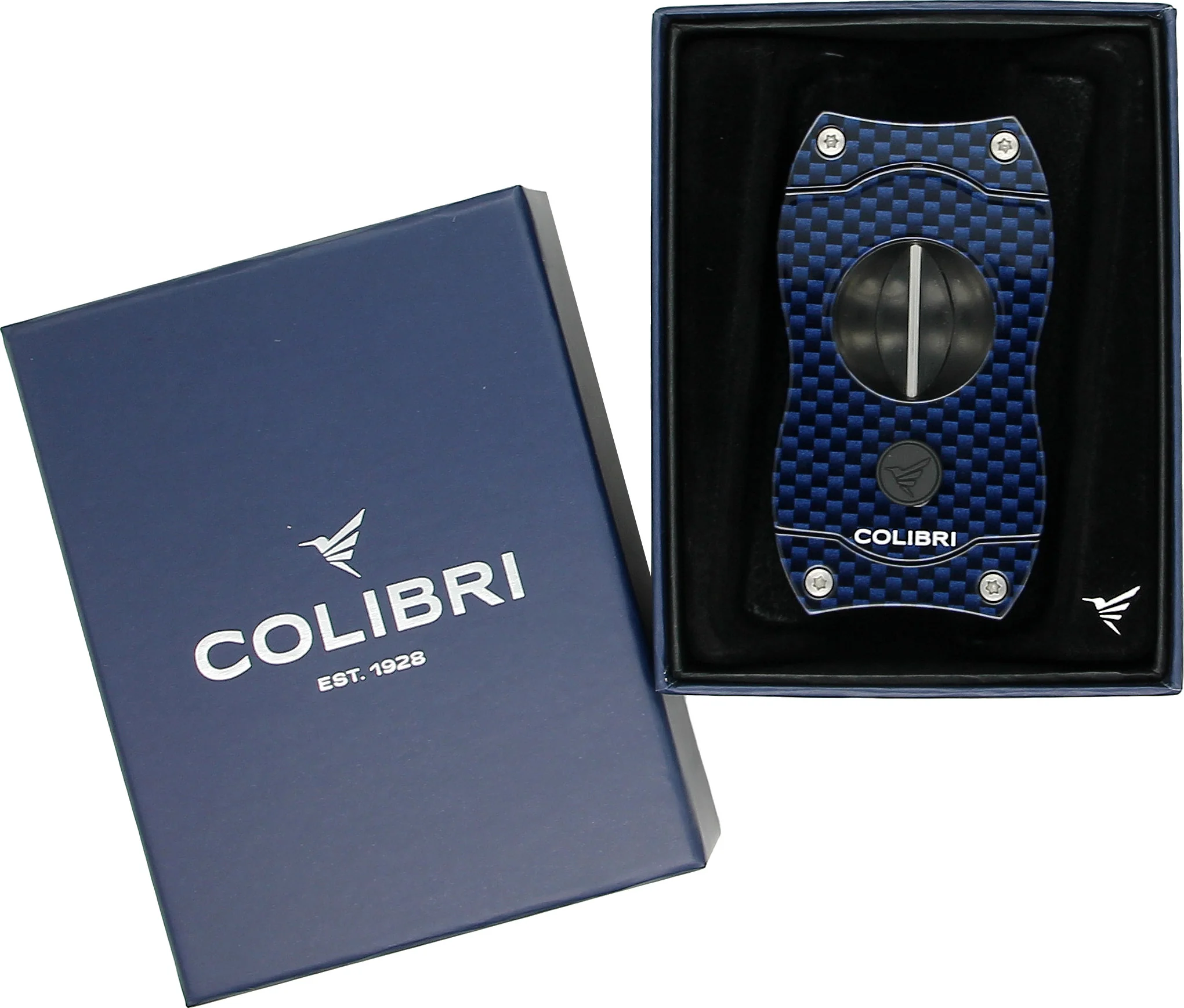 Producto patentado y duradero de la marca de renombre internacional Colibri. Este cortapuros con corte de muesca tradicional combina armoniosamente diseño y funcionalidad. Su moderno aspecto de carbono y su elegante color azul lo convierten en el producto favorito de muchos entendidos en puros. La cuchilla de acero inoxidable atraviesa sin esfuerzo la cabeza del puro y deja al descubierto una abertura en forma de V. Este artículo también es un regalo estupendo, ya que viene en una atractiva caja de regalo. El fabricante garantiza su funcionalidad durante 2 años.