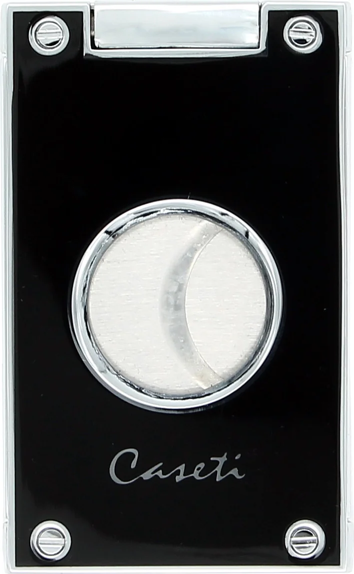 Esta lujosa creación presenta una laca negra y un acabado cromado adornado con un logotipo de Caseti de tamaño elegante que muestra que es un aficionado a los puros de gusto impecable. La forma rectangular también le da un aire de sofisticación, lo que hace que el cortapuros sea perfecto para las reuniones más formales.