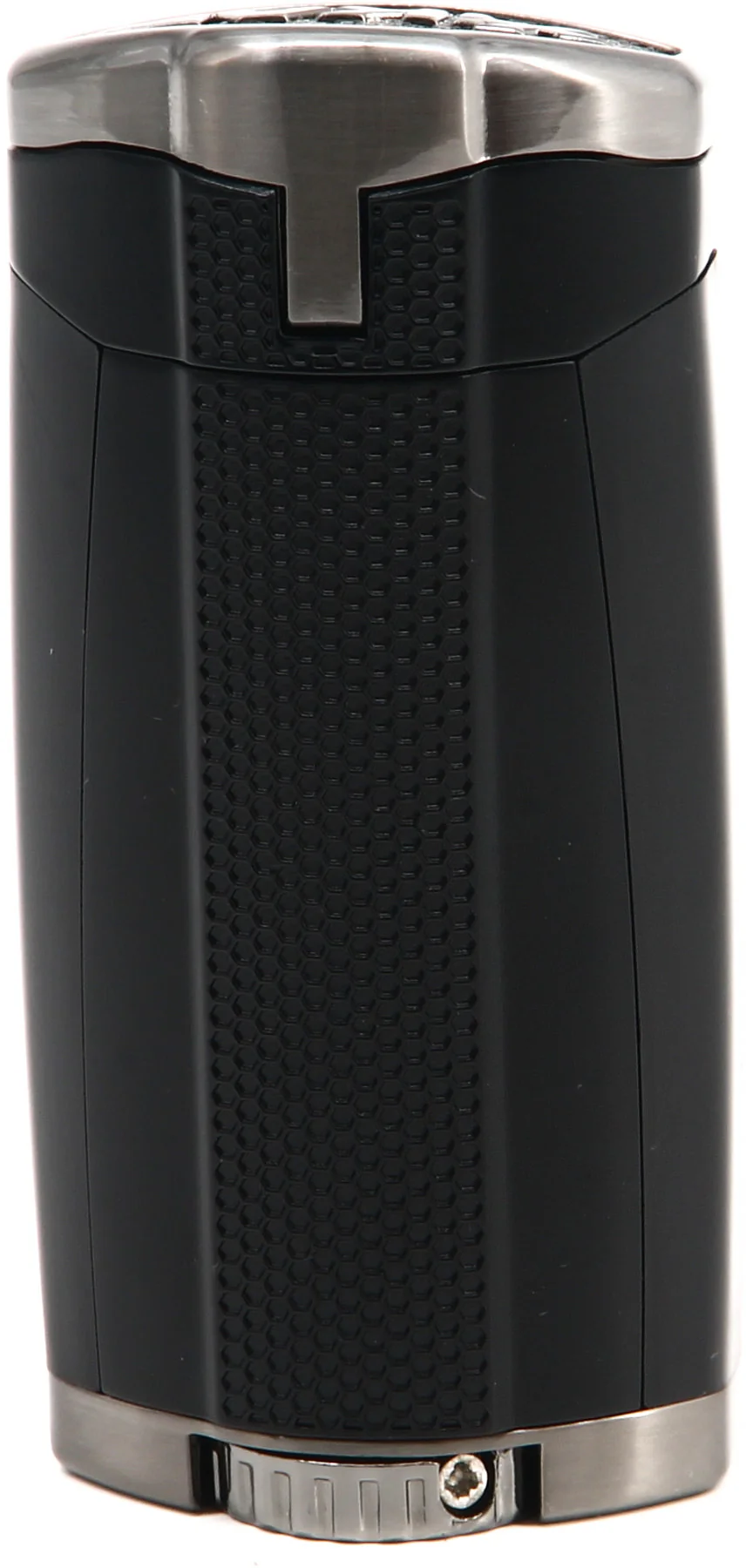La tapa protectora y el gatillo de encendido deslizable hacia abajo tienen una textura en forma de panal que proporciona un mejor agarre, así como un toque de estilo. Las potentes llamas de triple chorro en línea del HP3 brindan un control y una cobertura incomparables, lo que le permite encender puros de manera más eficiente sin importar las condiciones climáticas. Ajuste las llamas con la rueda de ajuste de gran tamaño ubicada en la base del encendedor. Echar un vistazo a los niveles de combustible nunca ha sido tan fácil con las grandes ventanas de nivel de combustible del HP3 ubicadas en un lugar destacado en la parte delantera del encendedor.