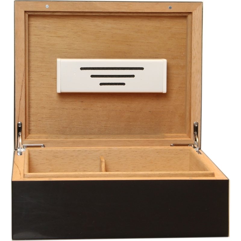 Este humidor está vestido con un llamativo acabado de laca de piano en negro que irradia lujo sin importar dónde se coloque. Abrir la tapa de esta belleza revela bisagras cuadrantes premium altamente duraderas que brindan un movimiento suave y una sensación sólida. El interior está forrado con cedro español y, junto con un divisor, crea un ambiente ideal para hasta 35 puros de tamaño Corona.