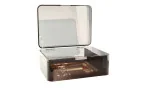 Las paredes tintadas del humidor permiten una visión discreta de tus puros, mientras que un cierre magnético plateado redondea armoniosamente el conjunto. Este cierre garantiza que el clima del interior permanezca protegido de forma óptima. En el interior, una bisagra plateada en el lado derecho da al humidor un detalle de estilo adicional.