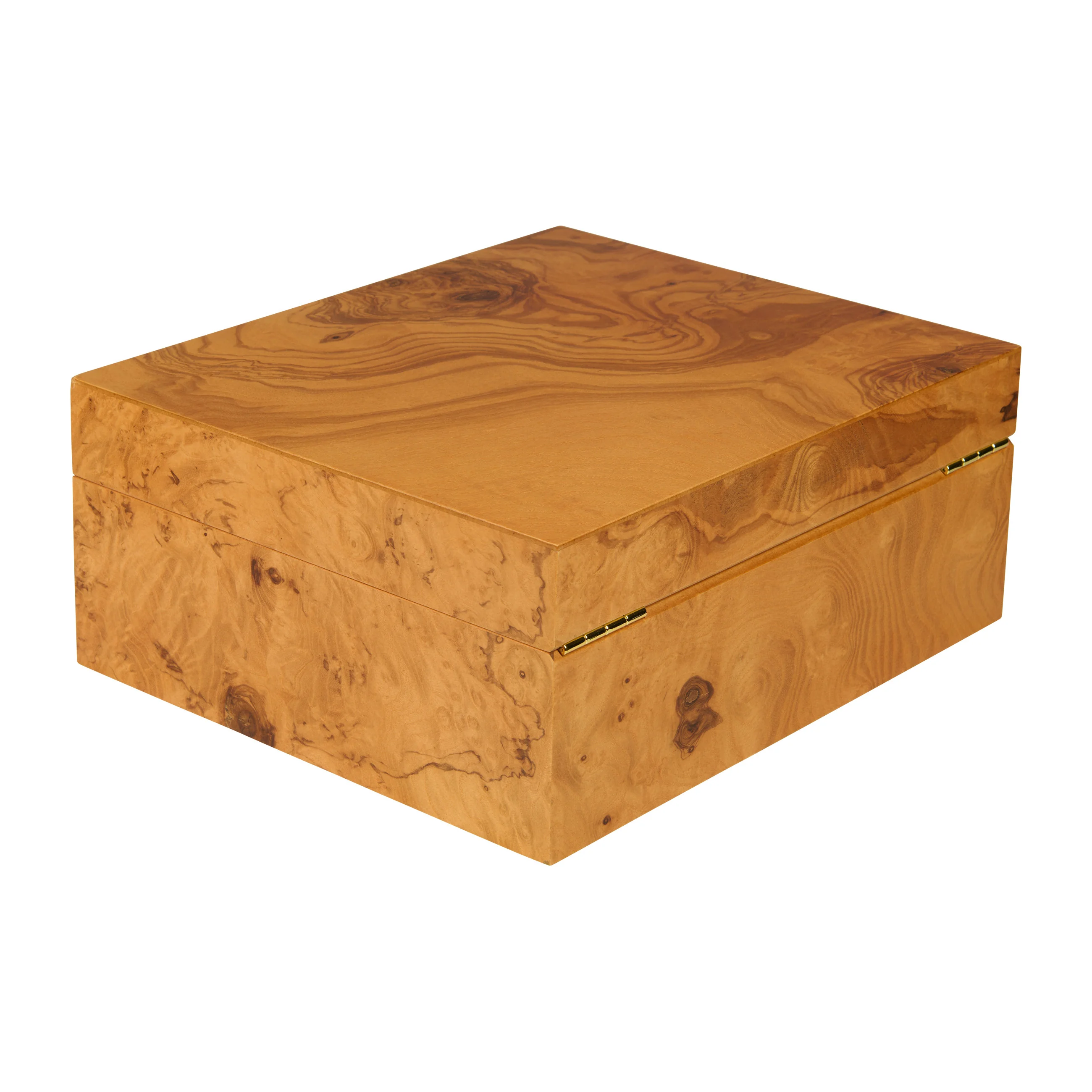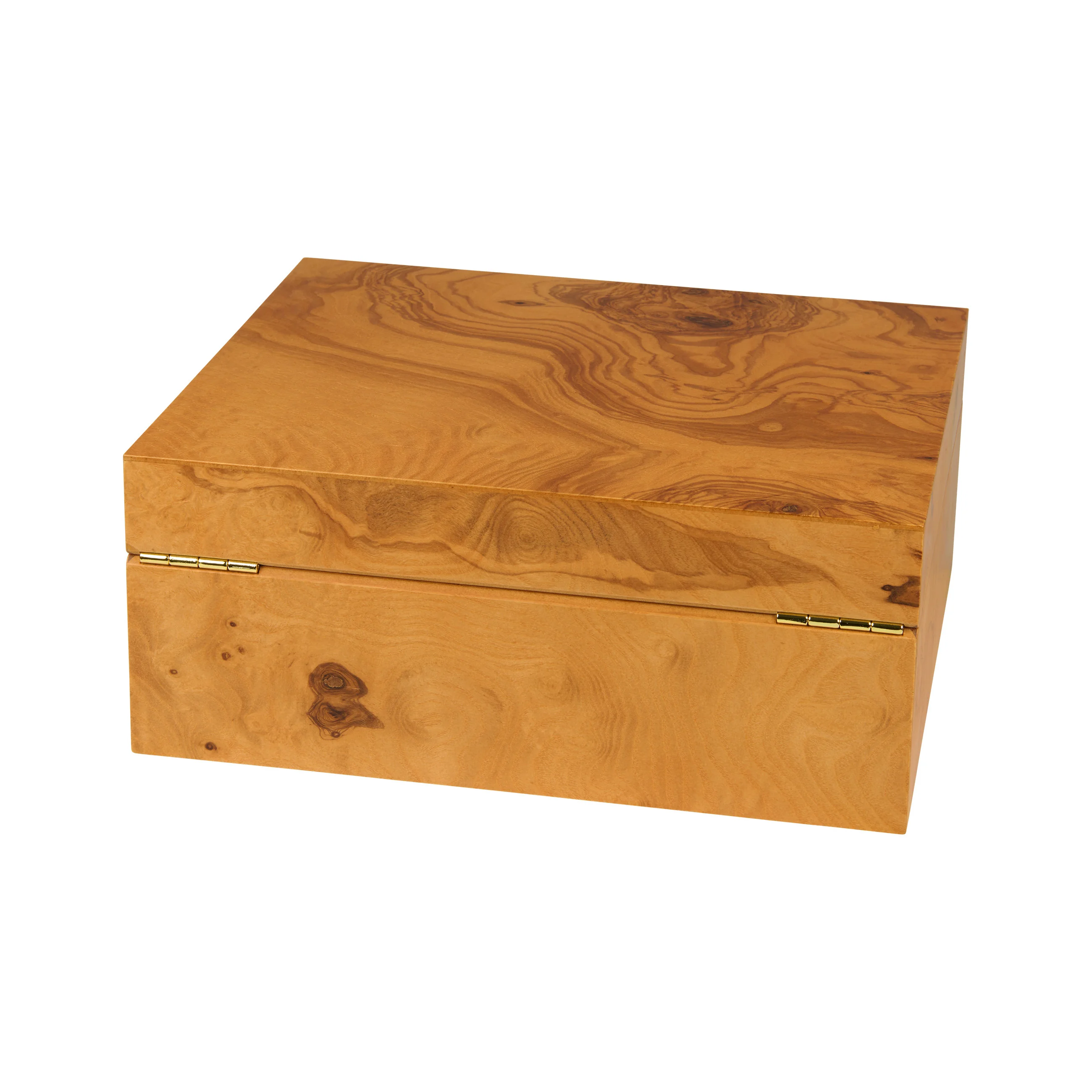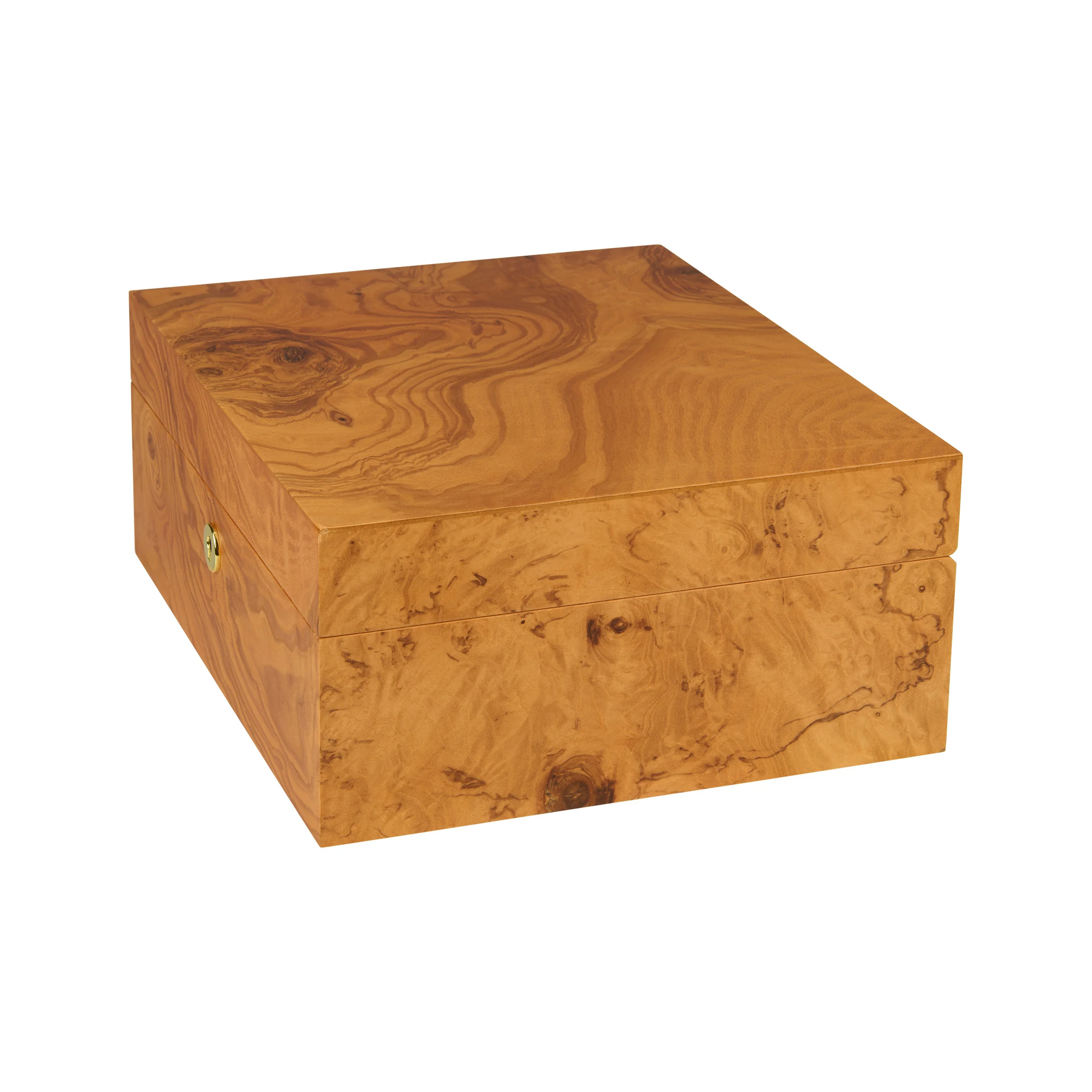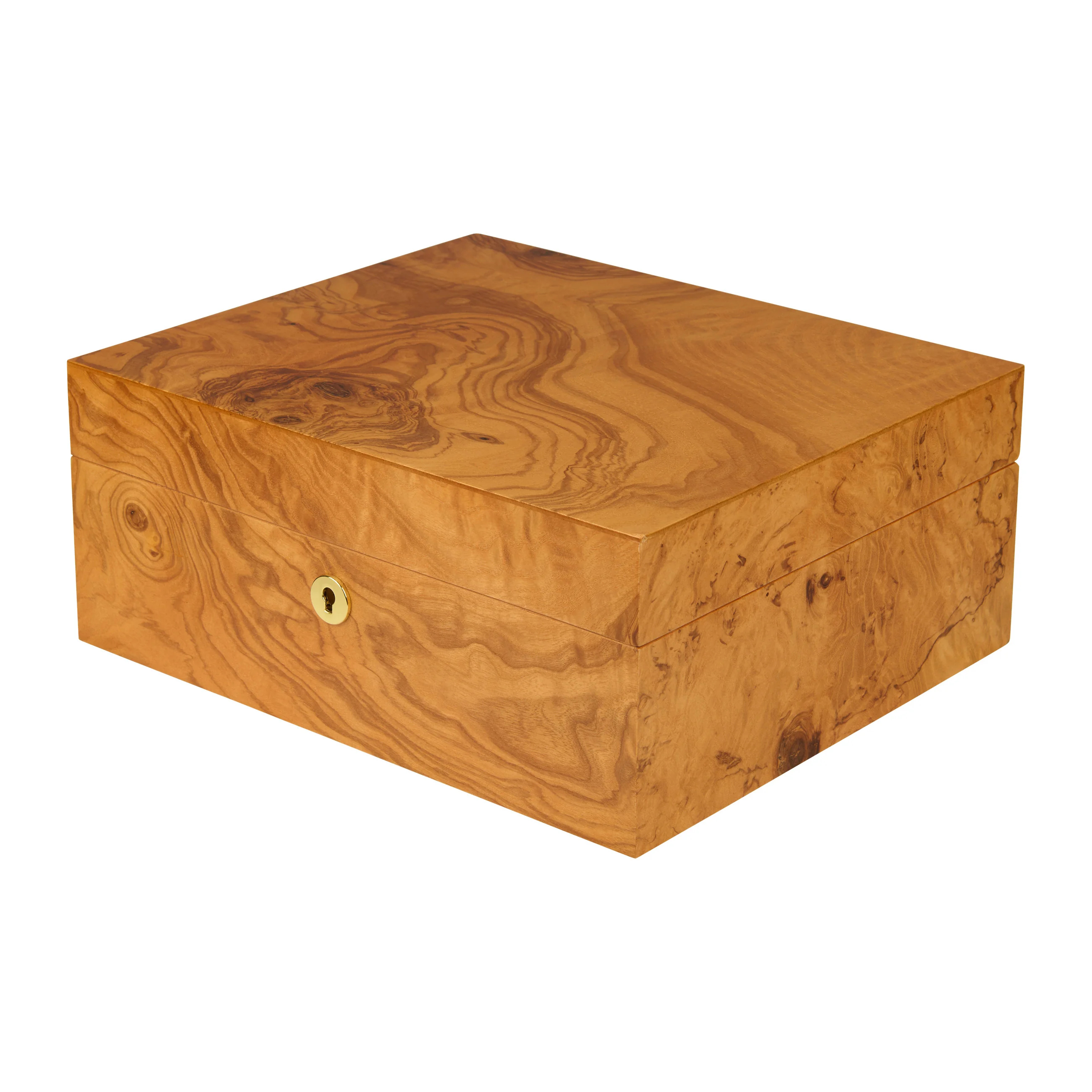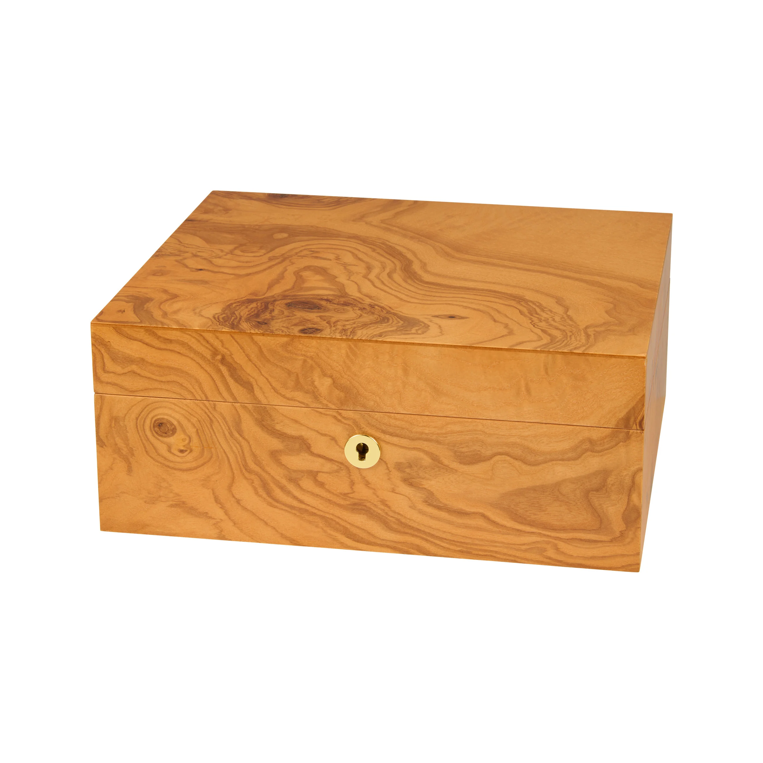 La madera de olivo destaca por su veteado característico, con tonos que van del amarillo miel al marrón dorado, entremezclados con vetas oscuras, casi de color chocolate. Gracias a su aspecto cálido, el humidor se integra armoniosamente en casi cualquier entorno. Los humidores medianos tienen capacidad para 75 puros, lo que proporciona un amplio espacio para su colección.