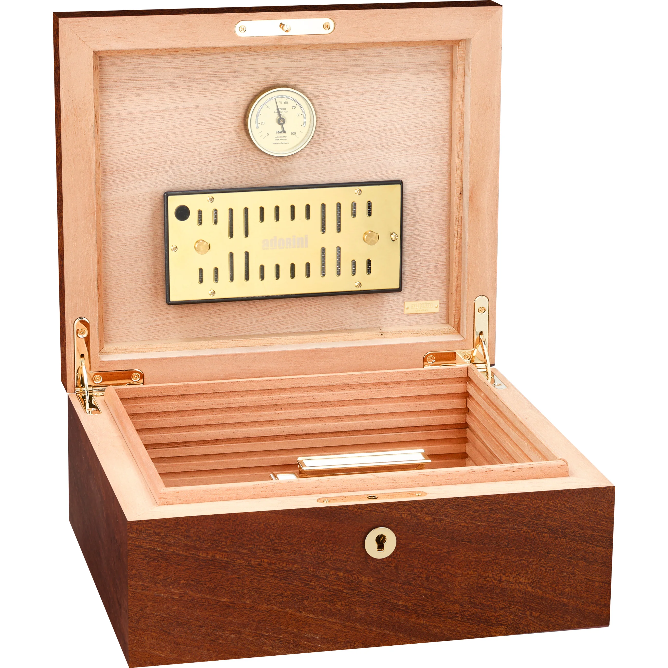 - Humidificador Adorini DeLuxe bañado en oro con humidificación por fibras acrílicas y aberturas de ventilación con tamaño ajustable para una regulación óptima del nivel de humedad