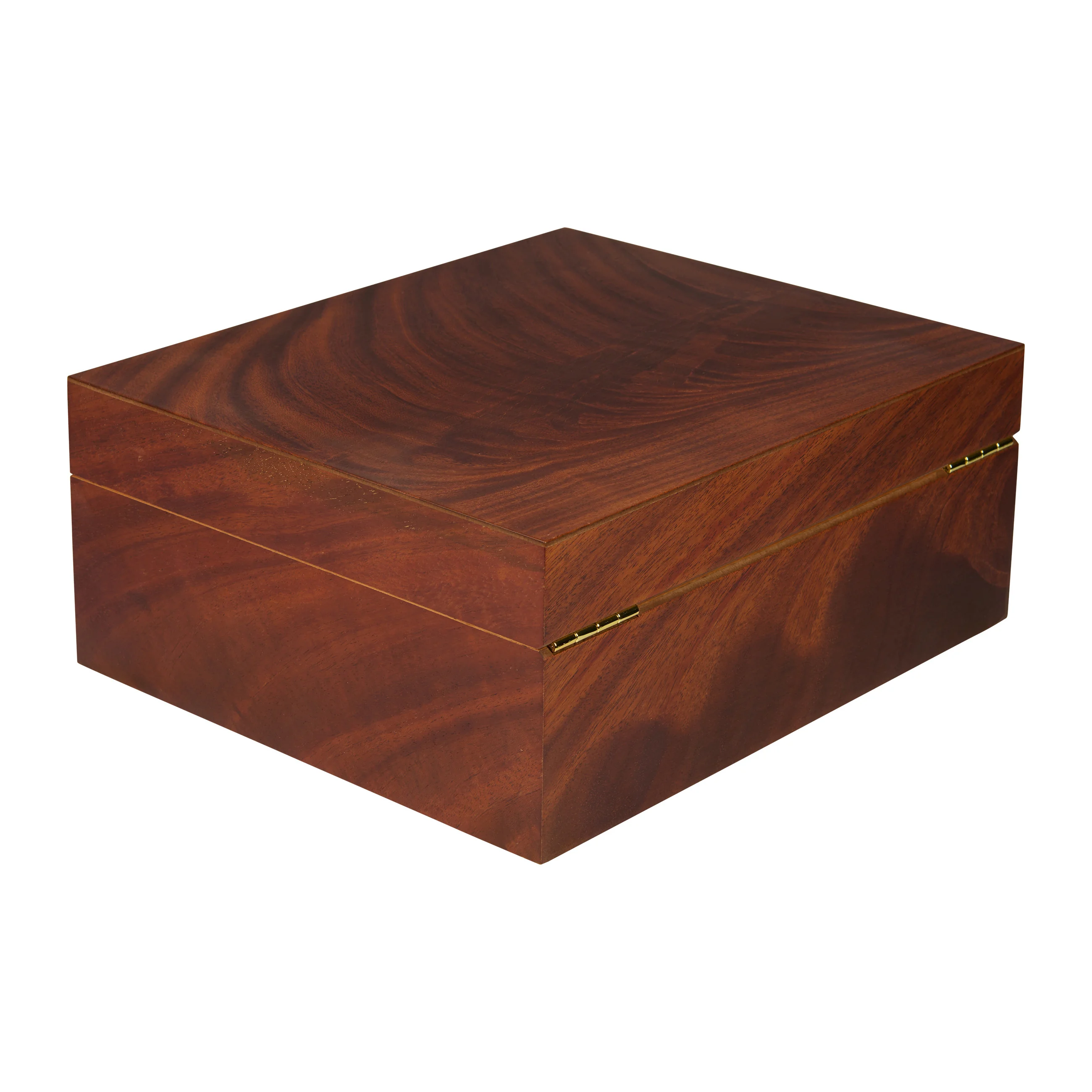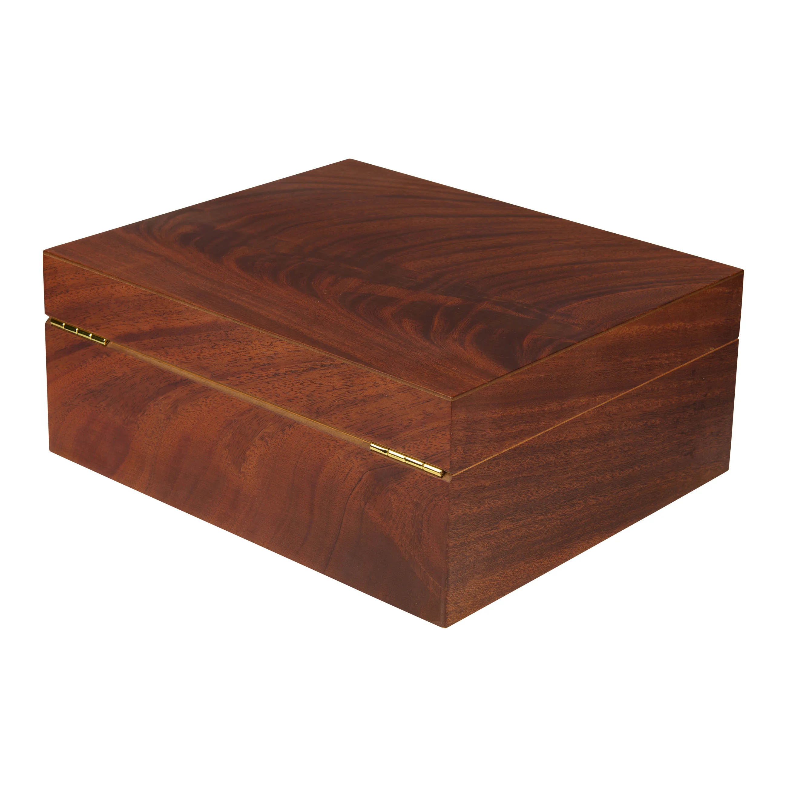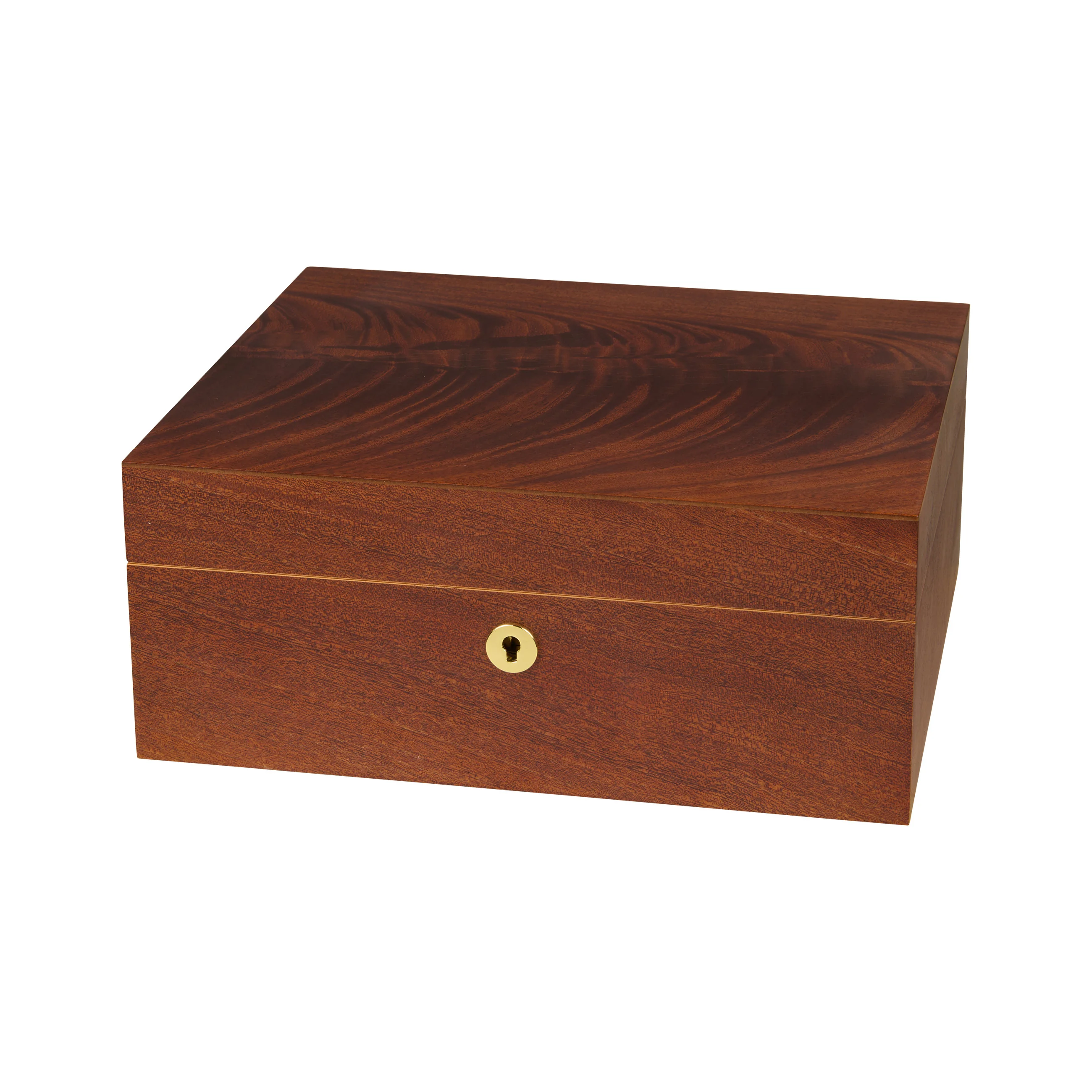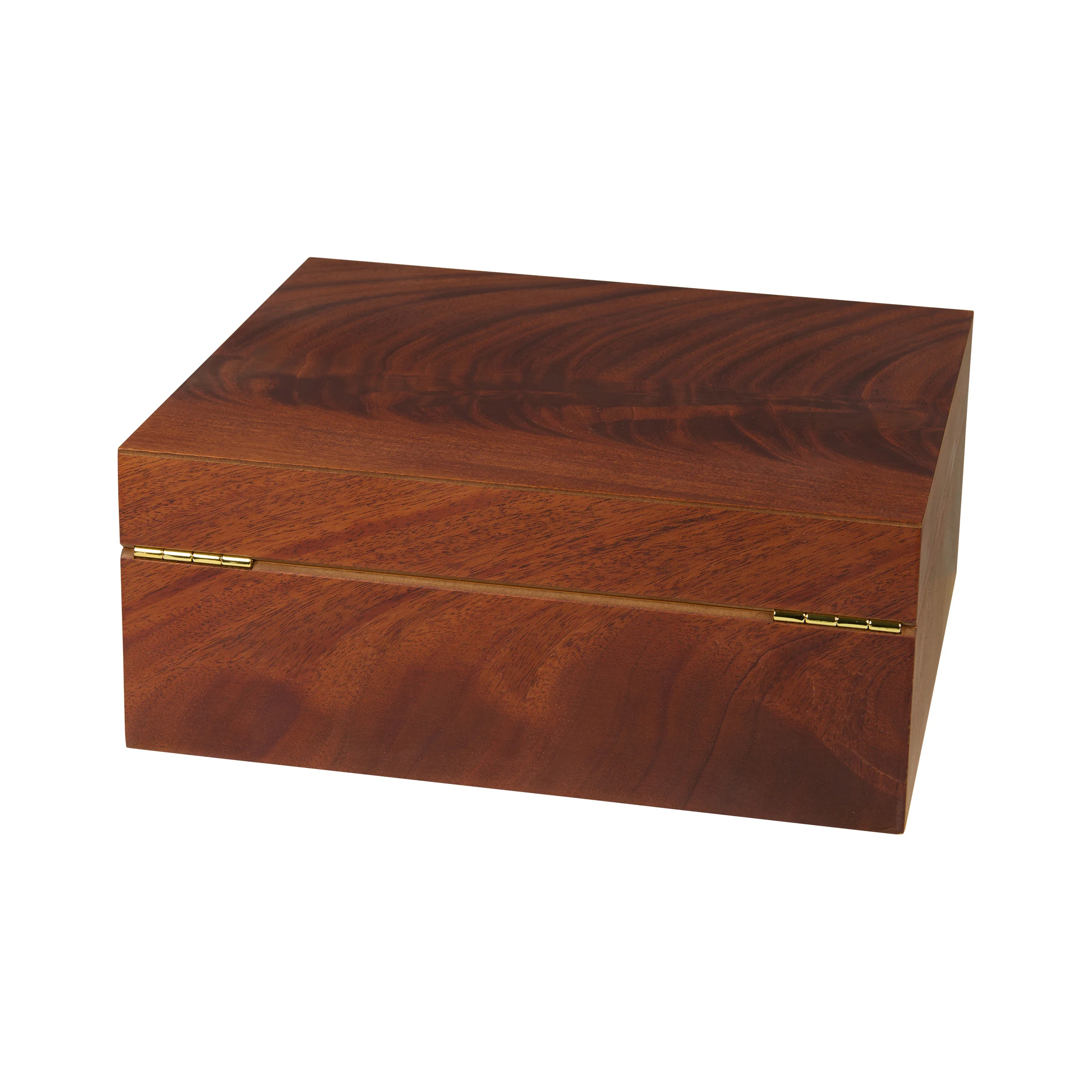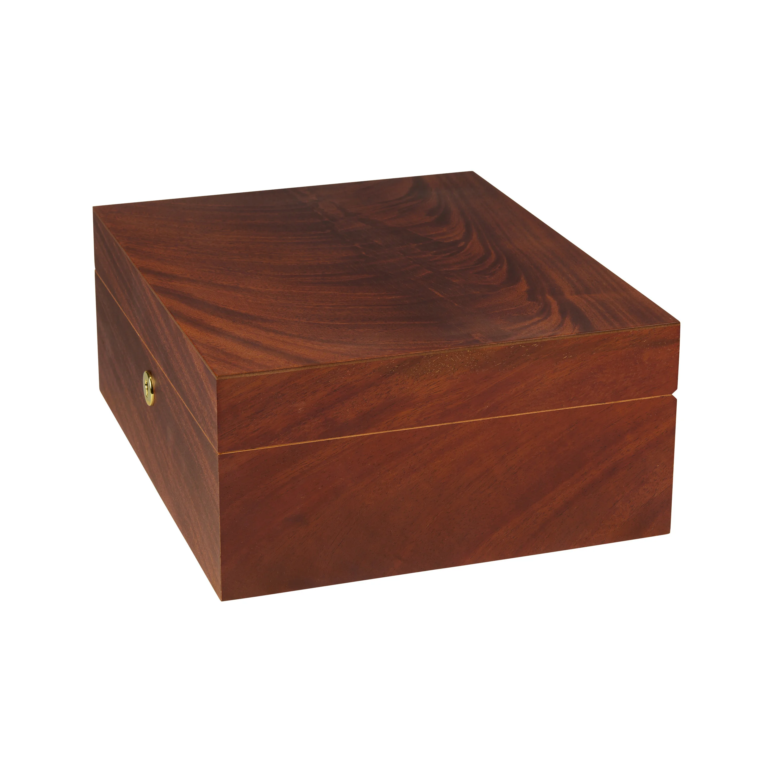 La madera de caoba impresiona por su veteado característico, con tonos que van del marrón-rojizo al marrón oscuro, entretejido con llamativos y fluidos patrones de veta que otorgan a la tapa una profundidad y un dinamismo excepcionales. Gracias a su aspecto cálido y natural, el humidor se integra armoniosamente en casi cualquier entorno. Los humidificadores de tamaño mediano tienen capacidad para 75 puros, lo que proporciona un amplio espacio para su colección.