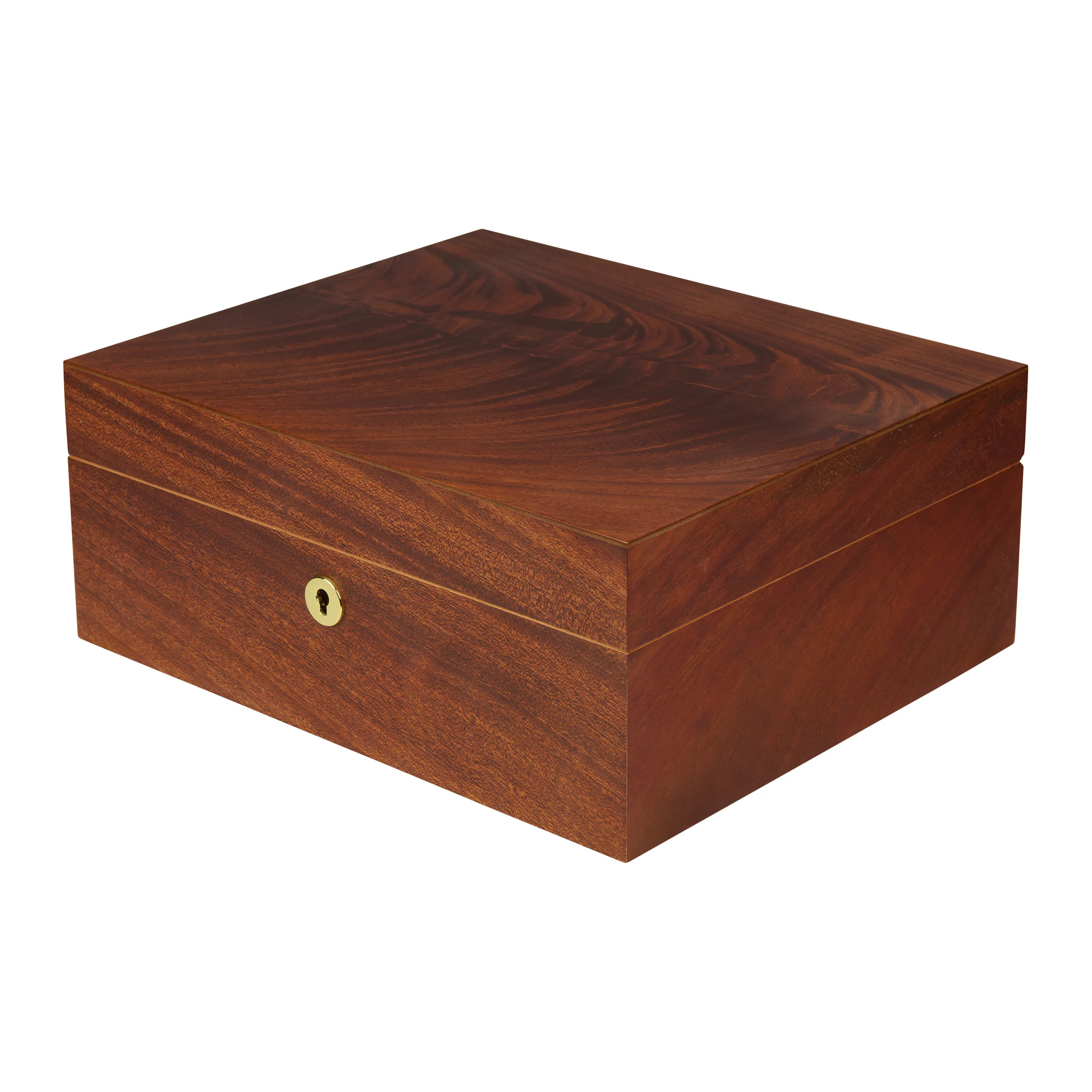 El humidor Siena Caoba Medium Deluxe de adorini es un elegante humidor de tamaño mediano que impresiona por su atractivo revestimiento de caoba. Las ligeras variaciones en el veteado y el color resaltan el carácter natural del revestimiento de madera auténtica y hacen que cada humidor sea único.