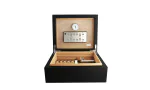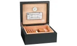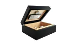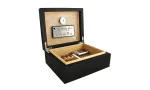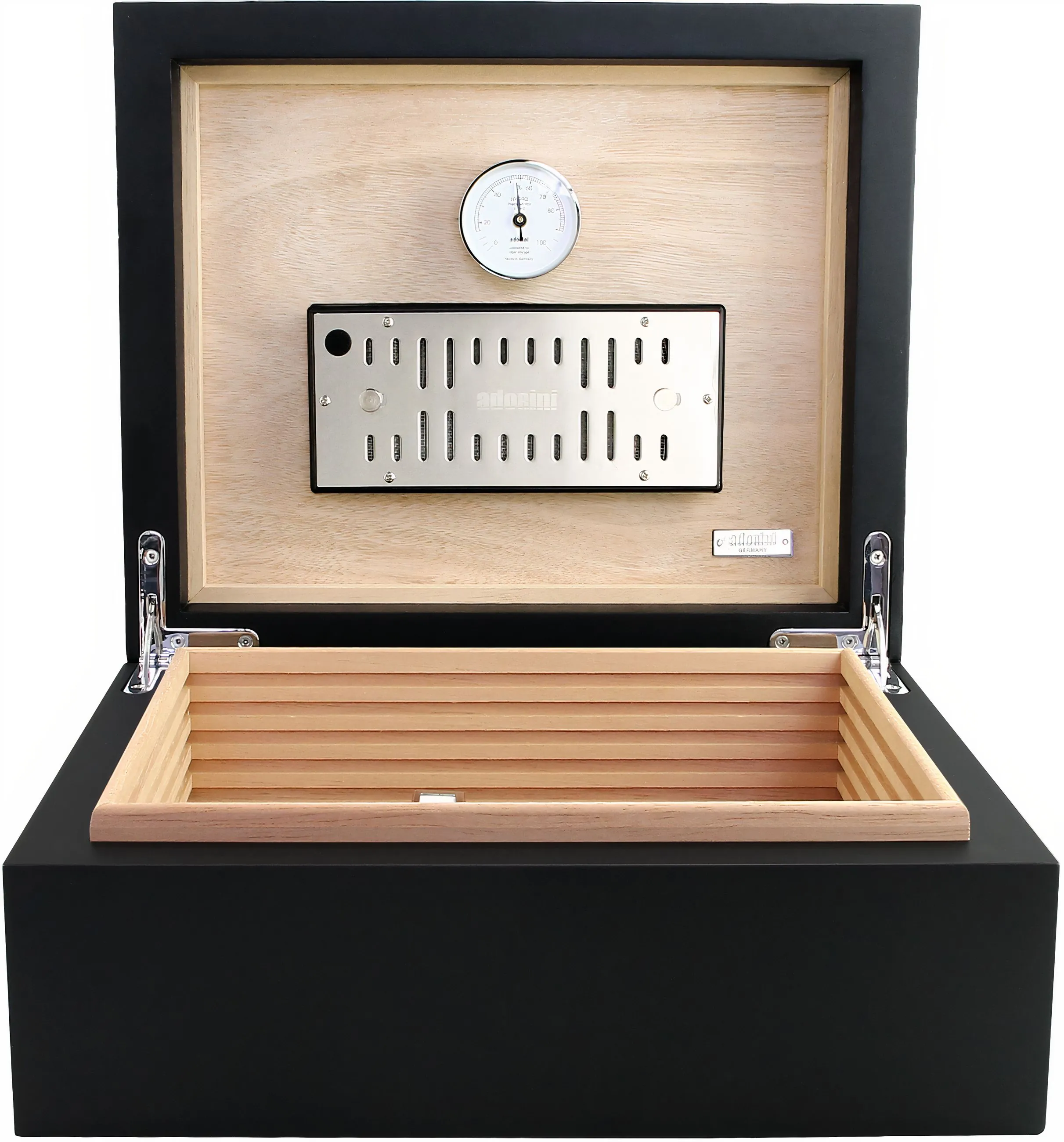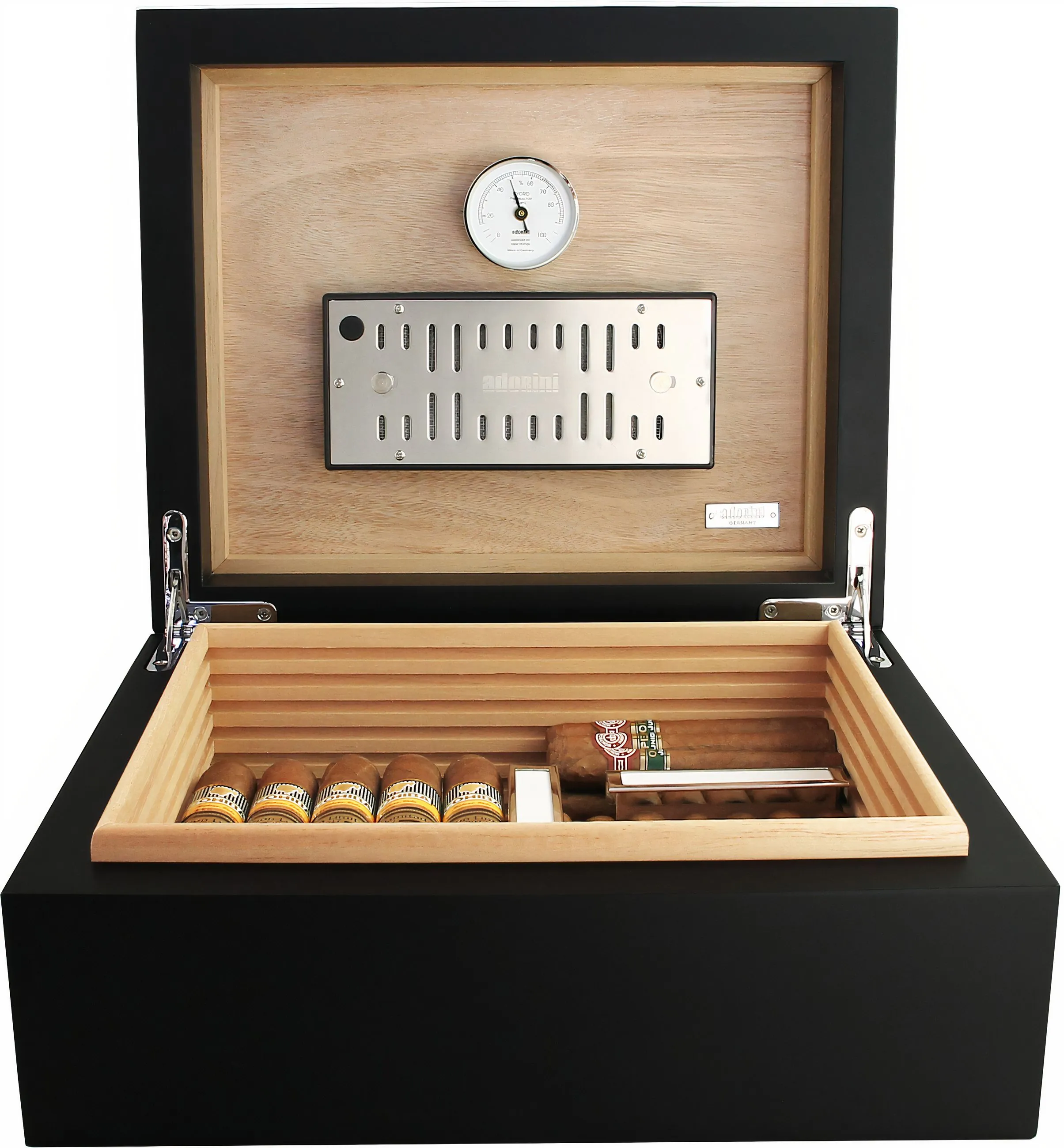 Un higrómetro de cabello preciso y pre-calibrado, fabricado en Alemania, permite un monitoreo preciso de la humedad. Ambos elementos pueden ser fijados magnéticamente a la tapa del humidor, lo cual es práctico y ahorra espacio.