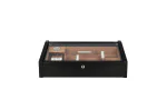 El acabado lacado en color negro acentúa maravillosamente las líneas limpias del humidor de construcción sólida, que cuenta con una parte superior inclinada con una tapa de cristal elegantemente diseñada, ideal para ver lo que hay en el interior. El revestimiento de cedro español al vapor presenta las innovadoras costillas de ventilación RibTech de adorini, que ayudan a aumentar el flujo de aire, asegurando que más de 75 puros del tamaño Corona se humedecen de manera adecuada y uniforme. Con cinco divisores verticales y cinco horizontales el sistema divisor de adorini con clips y etiquetas divisoras ofrece la flexibilidad de poder mantener los puros organizados, lo que convierte al Vega Deluxe en uno de los favoritos para negocios o salones.