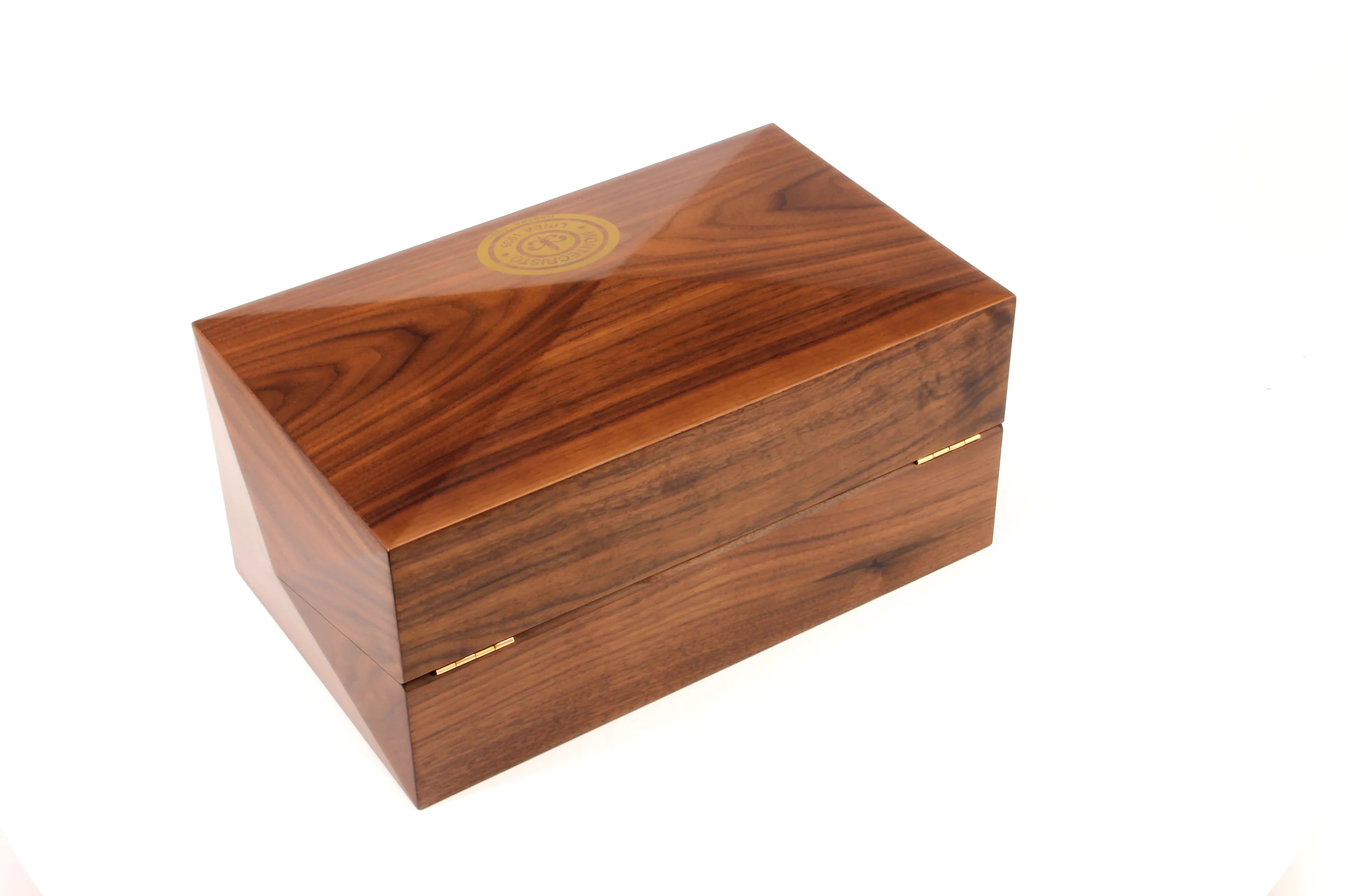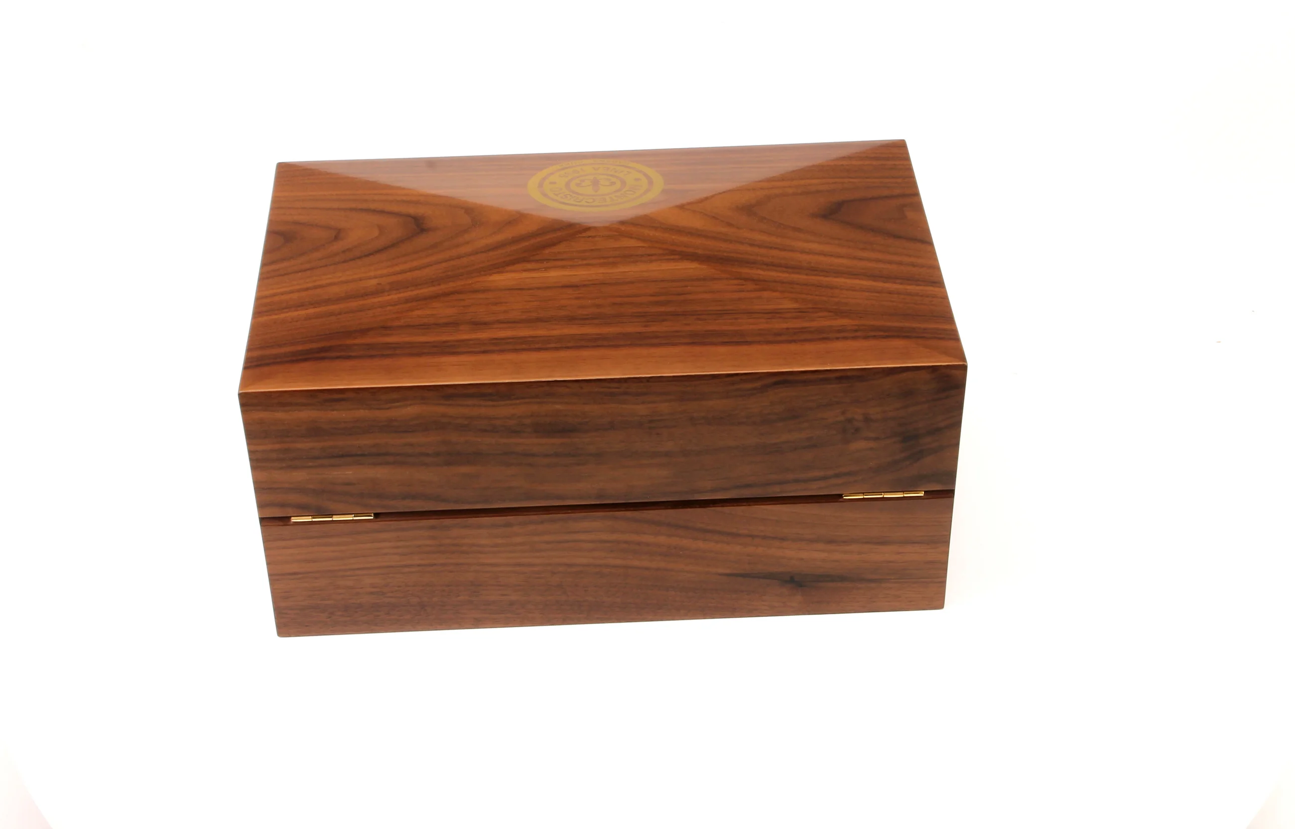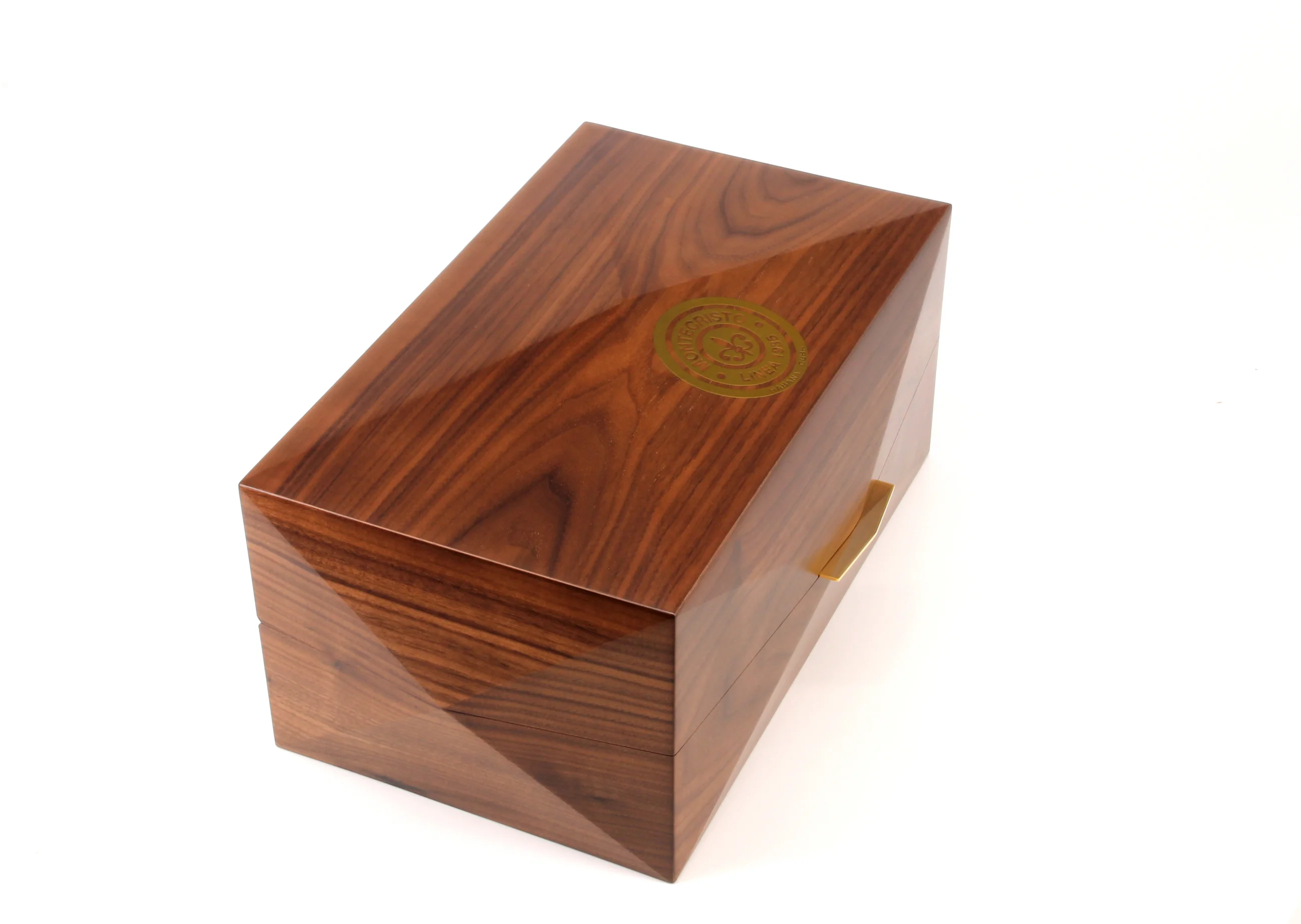 Este impresionante humidor de edición limitada fue elaborado en Italia con madera de cedro macizo, lo que lo convierte en un centro de mesa resistente y duradero para cualquier habitación. Cada lado del humidor está biselado y adornado con un acabado marrón oscuro que recuerda a la laca carmelita de las cajas de puros Linea 1935. Un logotipo de Montecristo redondo de color dorado descansa en la parte superior de la tapa, que se levanta fácilmente gracias a un mango de color dorado.