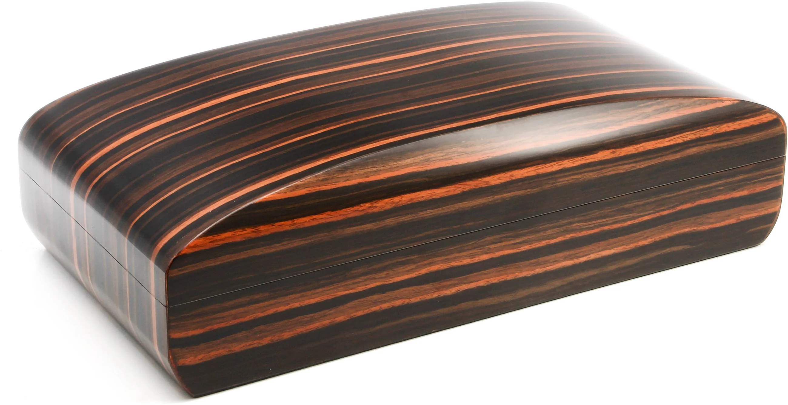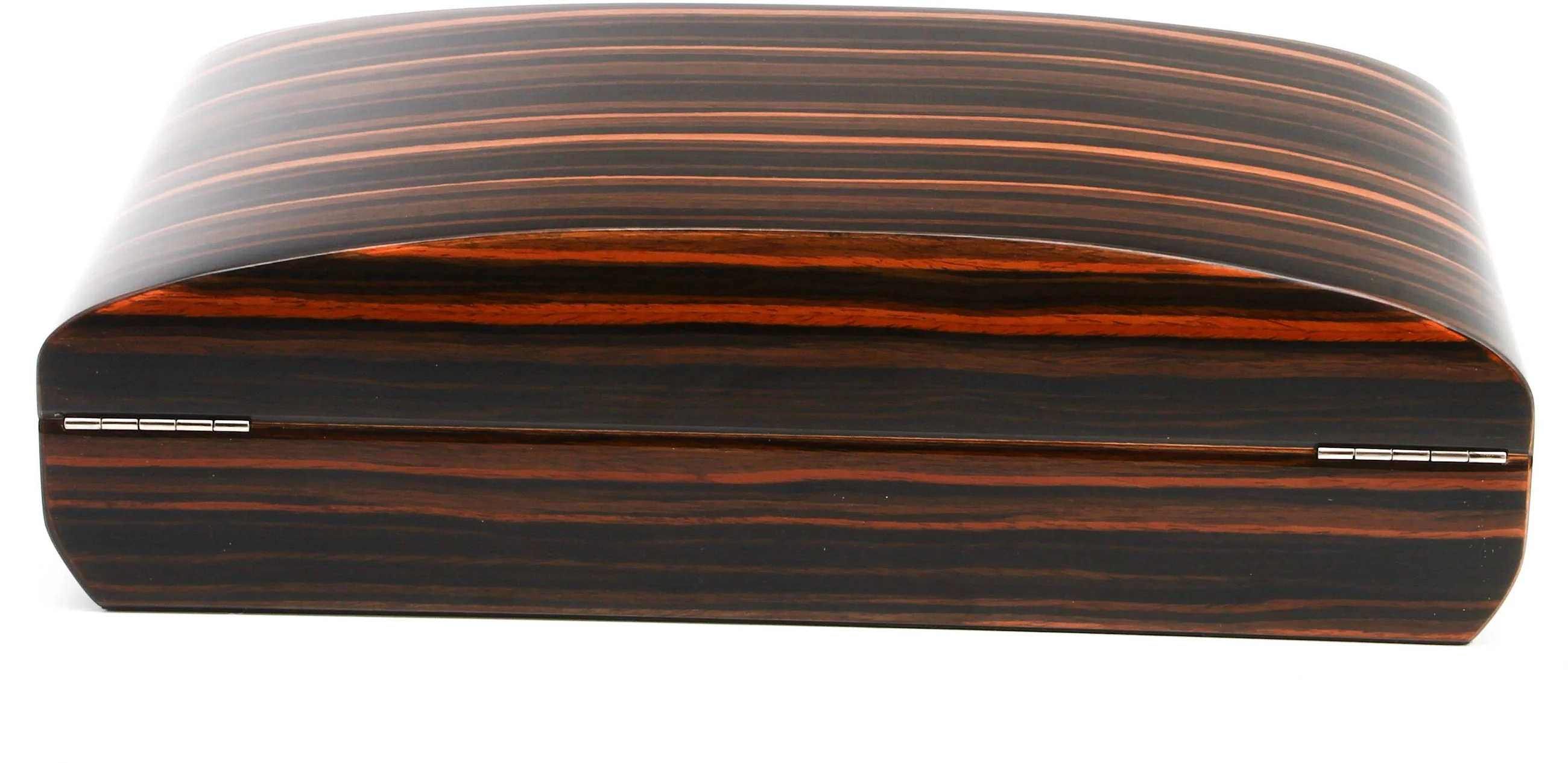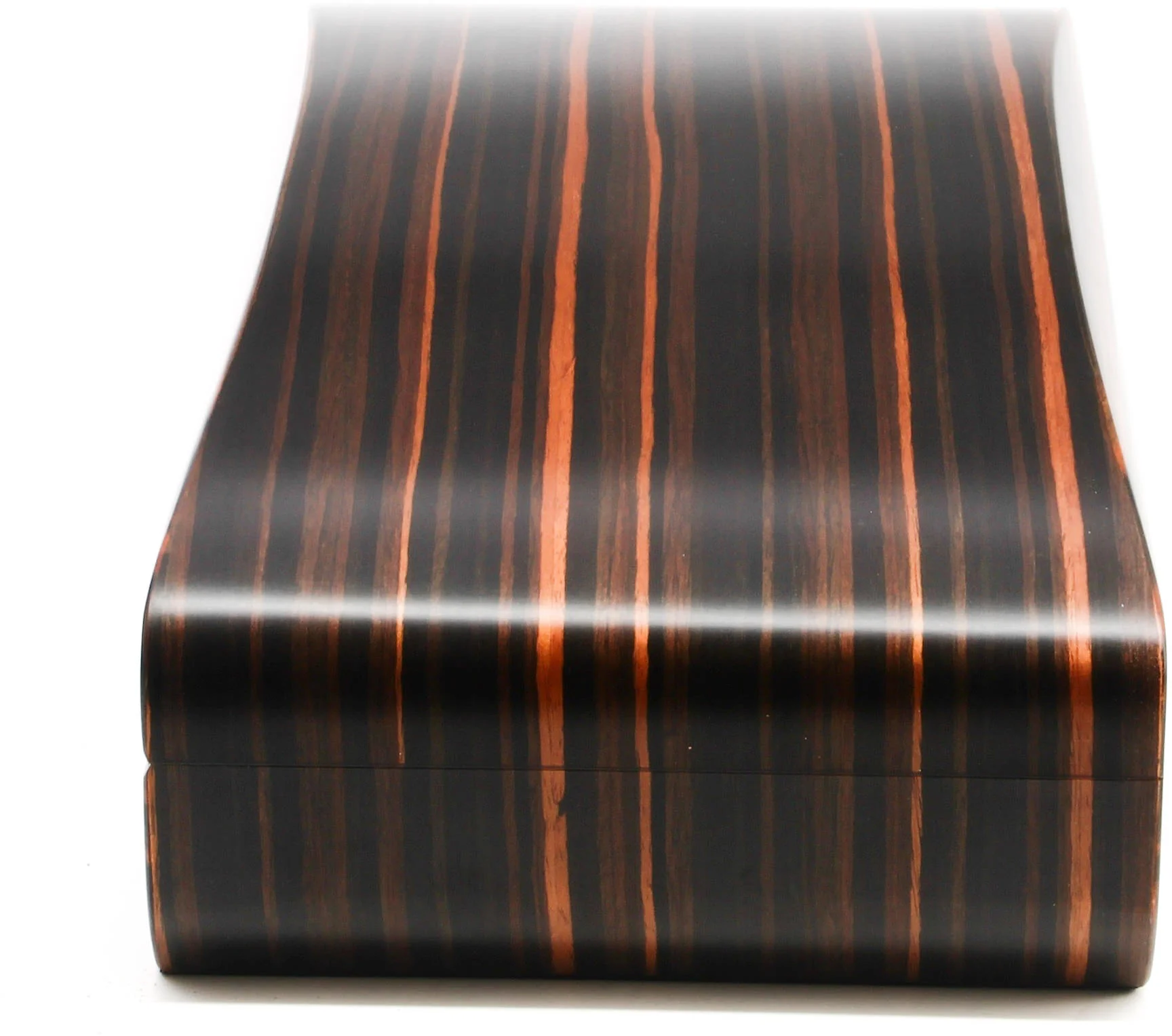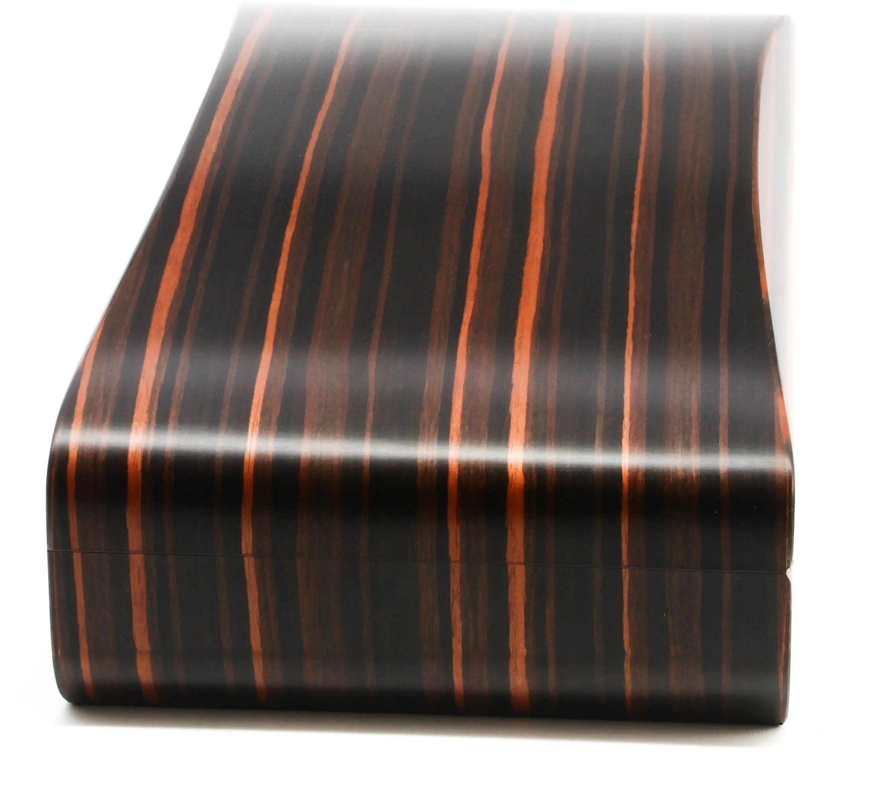 Con su forma alargada y curvas sensuales, esta impresionante pieza está muy lejos de ser un humidor común y corriente. La atractiva chapa de macassar emociona con amplios trazos de vetas de madera claras y oscuras, que fluyen maravillosamente sobre la sofisticada forma ovalada del humidor.