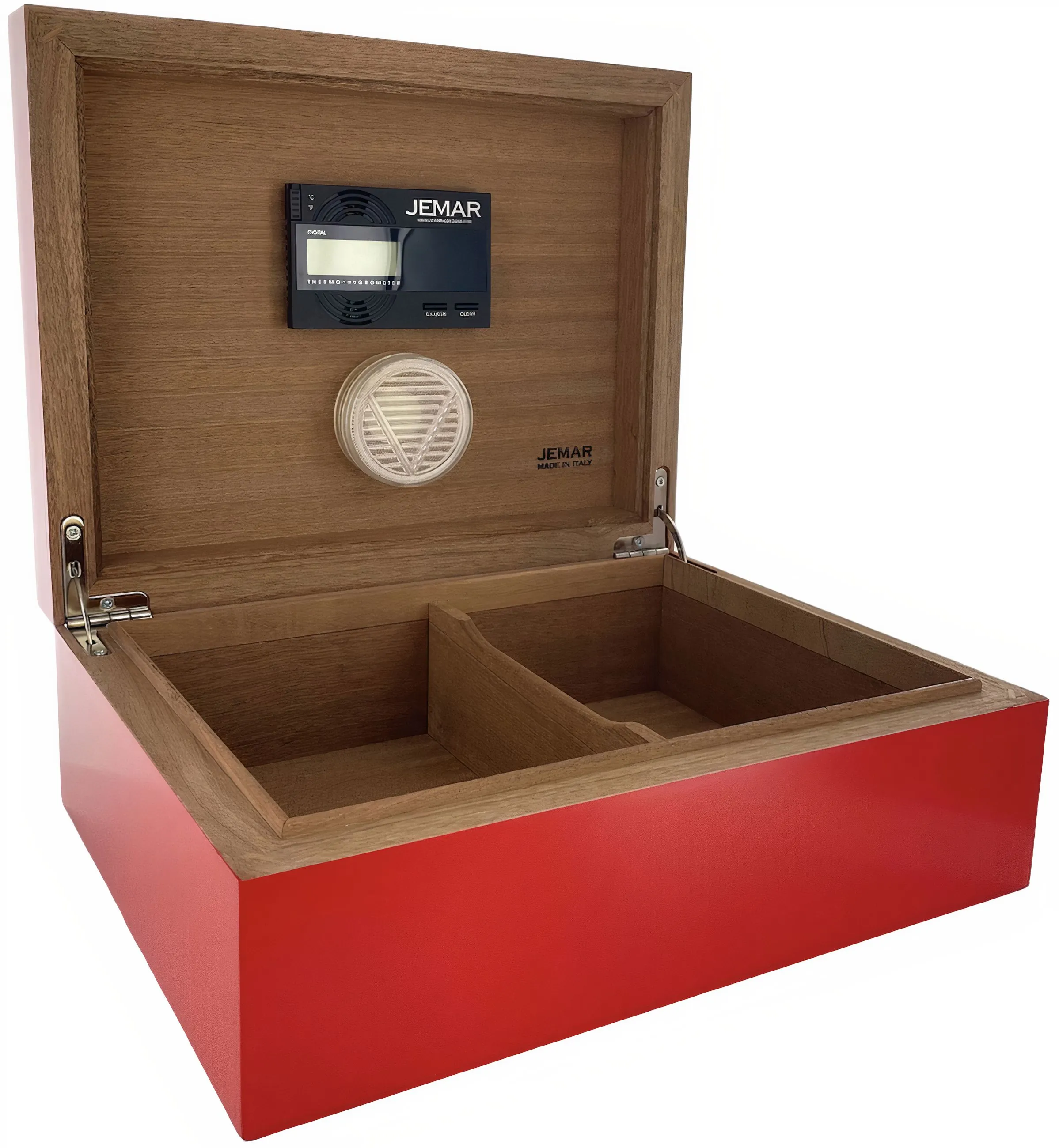 Las bisagras del humidor son de acero inoxidable y están fabricadas en Alemania, símbolo de alta calidad y durabilidad. El humidor Jemar está equipado con un higrómetro electrónico y un humidificador pasivo. Ambos elementos pueden fijarse a la tapa del humidor mediante los imanes incluidos, lo que permite supervisar y controlar fácilmente la humedad interior.