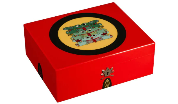 El Humidor Tótem Rana Sanadora, una impresionante obra de arte en elegante color rojo y lacado en alto brillo, es una pieza central para cualquier aficionado a los puros. Con capacidad para hasta 75 puros, no solo es funcional, sino también un accesorio con estilo.