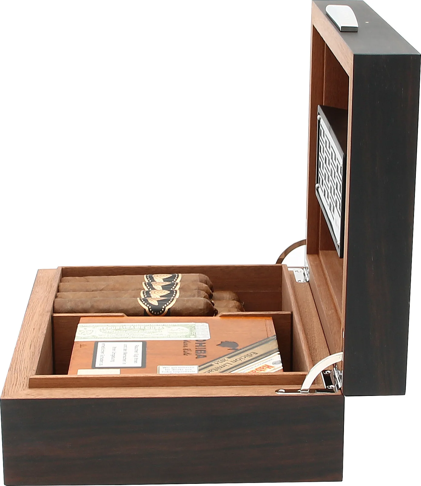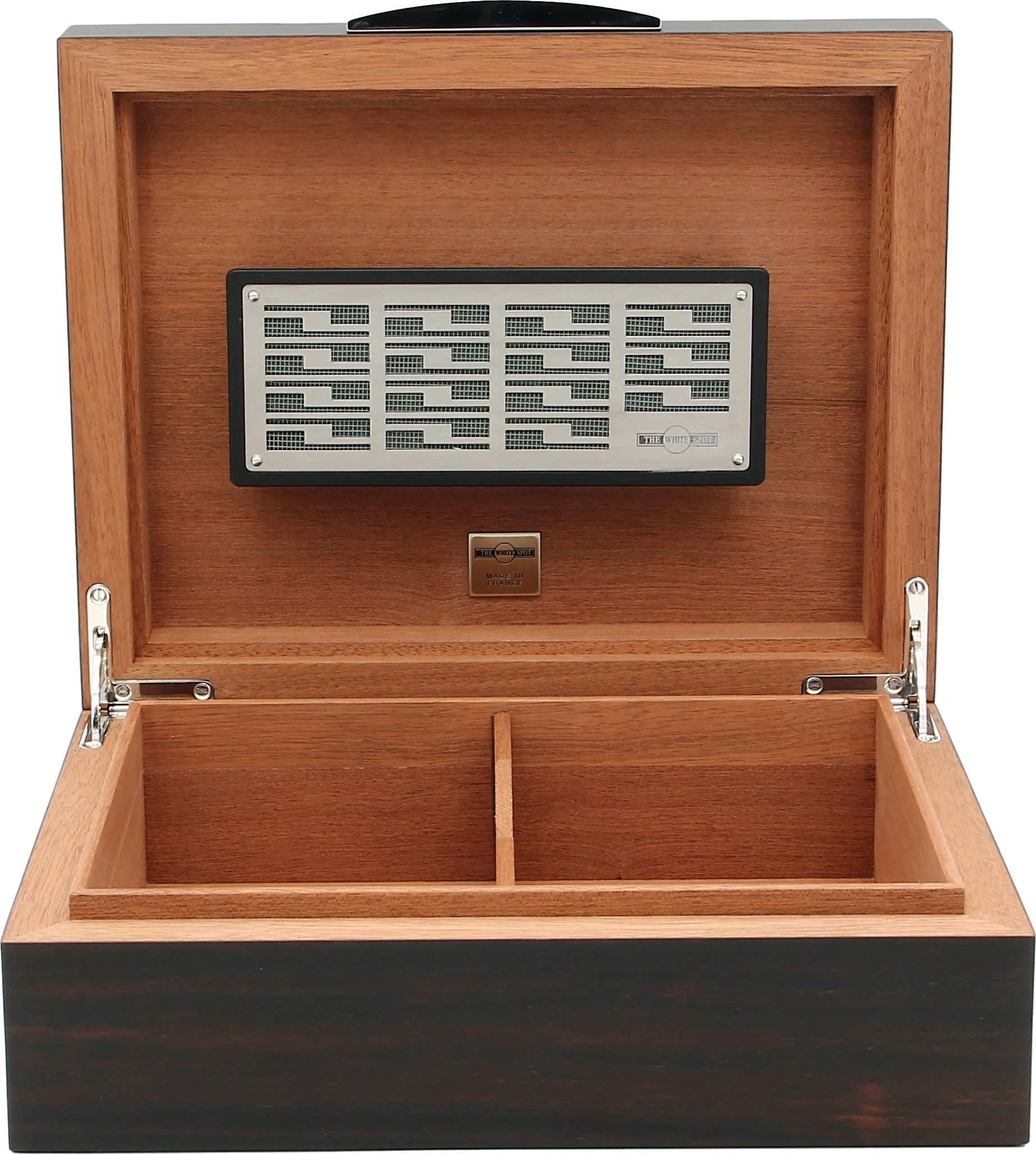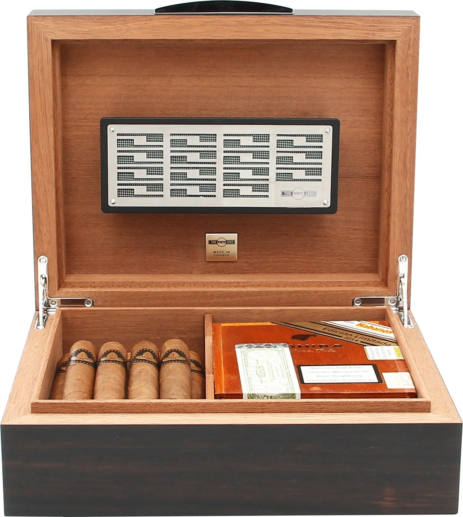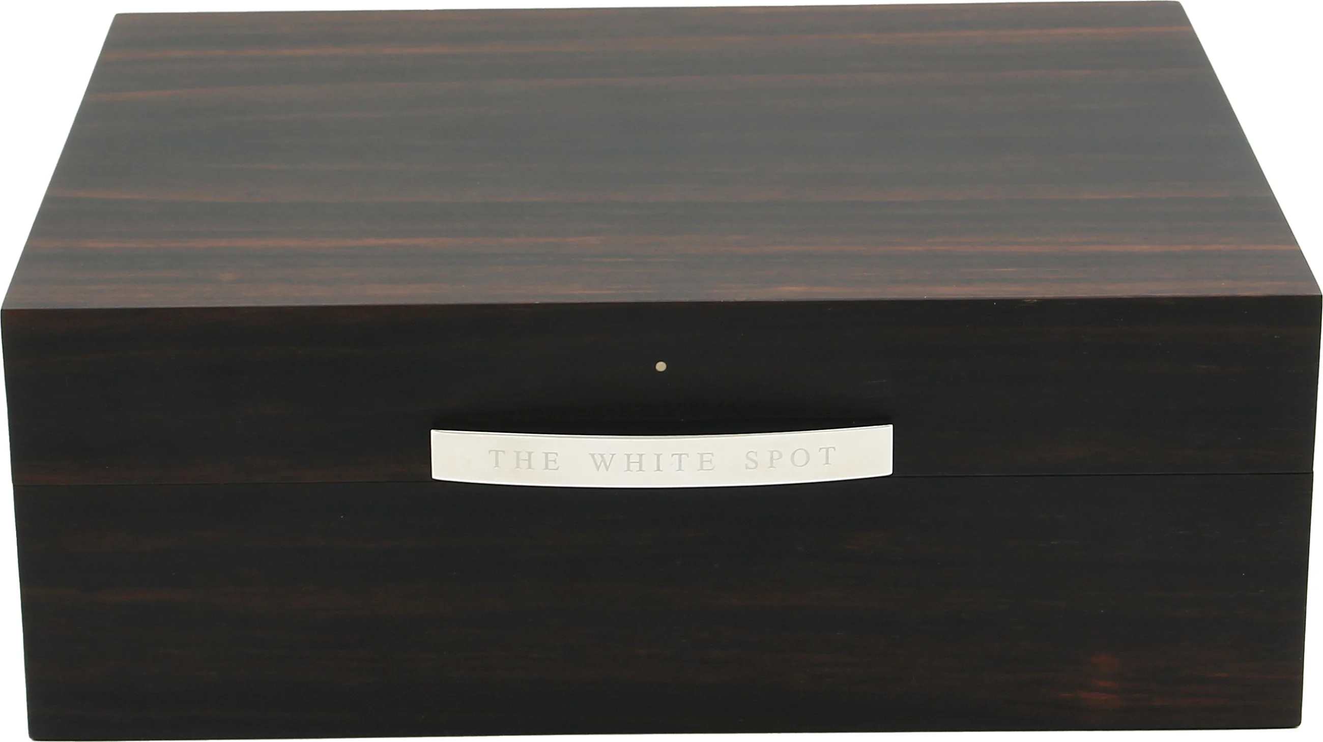 Con una capacidad aproximada para 50 puros, ofrece un amplio espacio para su colección o incluso para cajas de puros más pequeñas. La elegante asa de cromo brillante, grabada con el logotipo de White Spot y el famoso punto blanco, subraya el aspecto general estéticamente armonioso y la exclusiva identidad de la marca. Incluso a primera vista, está claro que se trata de un producto de marca de alta calidad.