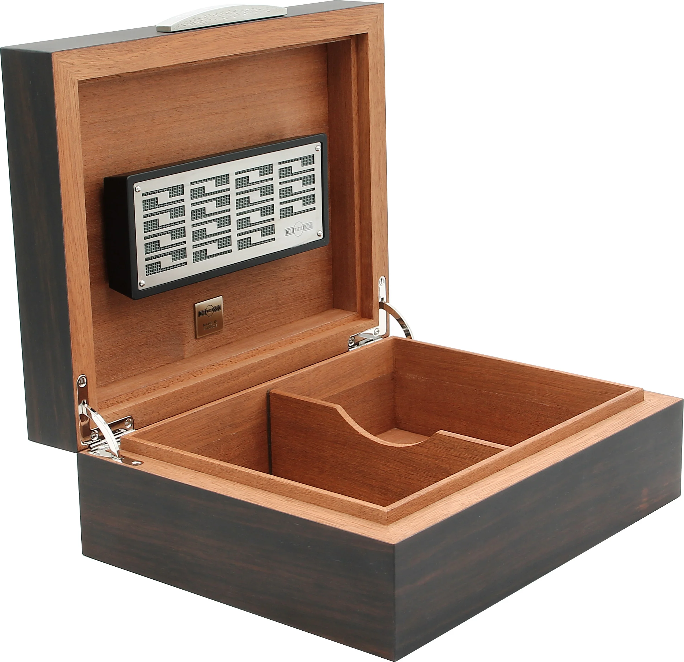 El humidor White Spot by Dunhill es un fino humidor de la tradicional marca inglesa Dunhill, fabricado con chapa de madera de Macasar de alta calidad en un elegante color marrón oscuro con un veteado fino y sutil. Este humidor encarna la elegancia clásica y la mejor artesanía, una joya para los amantes de los puros más exigentes.